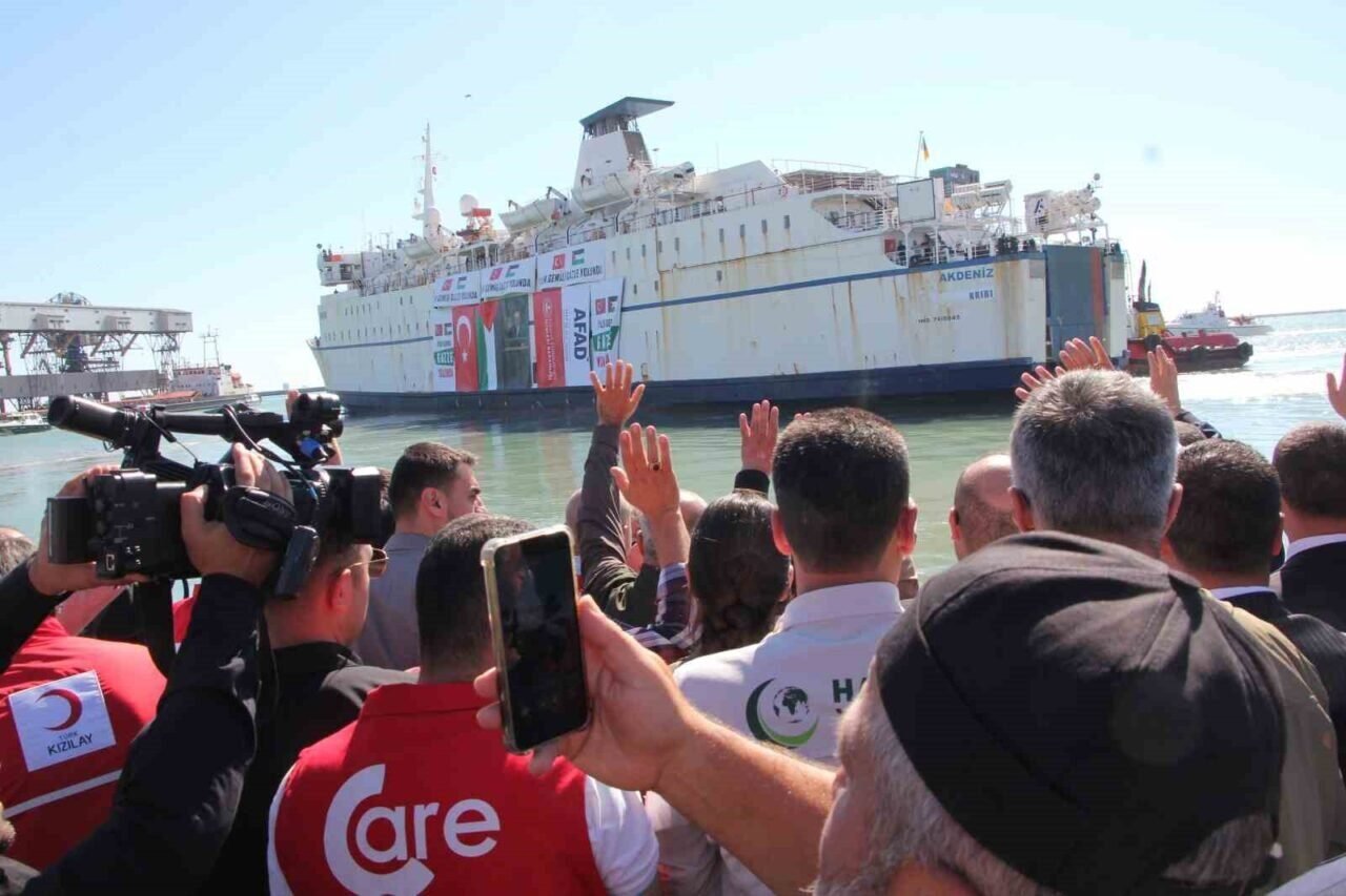 AFAD koordinasyonunda, 17 sivil toplum kuruluşunun desteğiyle hazırlanan insani yardım malzemelerini Gazze’ye ulaştıracak olan 17. İyilik Gemisi, İçişleri Bakanı Ali Yerlikaya’nın katıldığı törenle Mersin Limanı’ndan uğurlandı. Bakan Yerlikaya’nın yanı sıra Bakan Yardımcısı Münir Karaloğlu, AFAD Başkanı Ali Hamza Pehlivan, Mersin Valisi Atilla Toros, AK Parti Mersin Milletvekili Ali kıratlı, sivil toplum kuruluşu temsilcileri ve çok sayıda davetlinin katıldığı törende dualar eşliğinde uğurlanan Akdeniz isimli gemide 50 tırlık yaklaşık 900 ton gıda ve hijyen malzemelerinin yer aldığı belirtildi. Yardım malzemelerinin Gazze’ye ulaştıktan sonra AFAD ve Kızılay koordinasyonunda dağıtılacağı bildirildi.