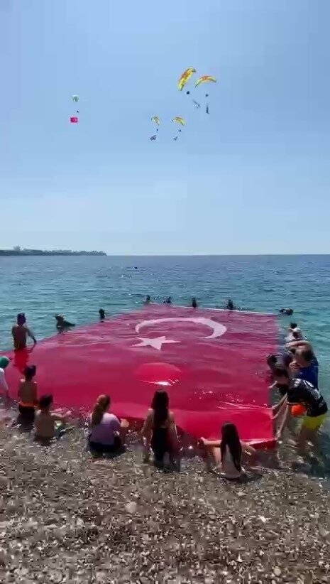 Antalya’da 19 Mayıs Atatürk’ü Anma Gençlik ve Spor Bayramı nedeniyle dalgıç ve yüzücüler Konyaaltı sahilinde dev Türk bayrağı açtı. Türk Hava Kurumuna bağlı paramotorcular ise gösterileri ile etkinliğe eşlik etti.
