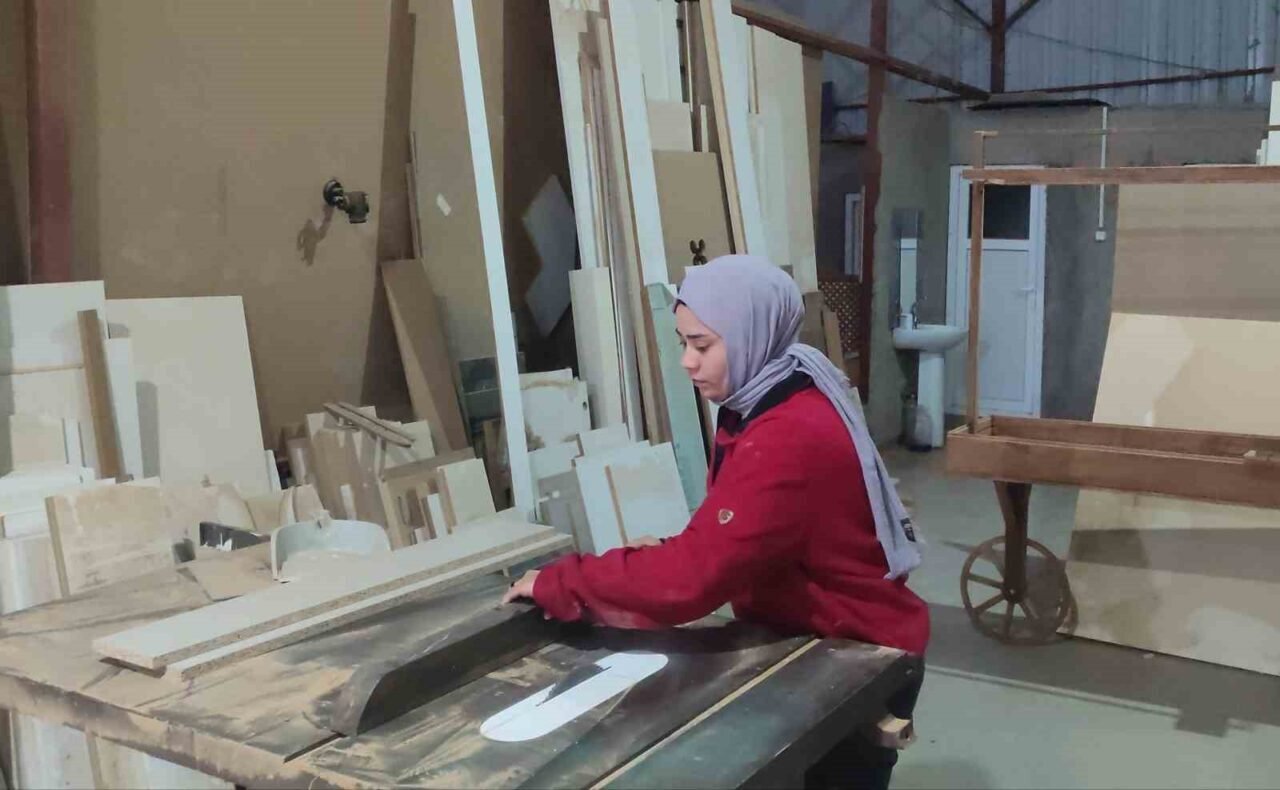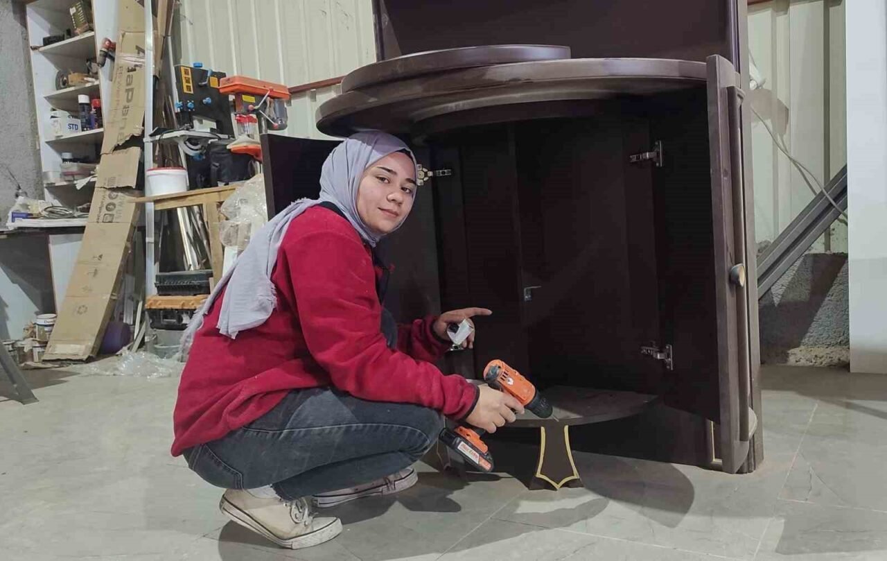 Kahramanmaraş’ta yaşayan 19 yaşındaki Hatice Kübra Topaktaş, babasının yanına yardım için gittiği atölyede 5 yıldır dolap, masa ve birçok ahşap ürün üretiyor.