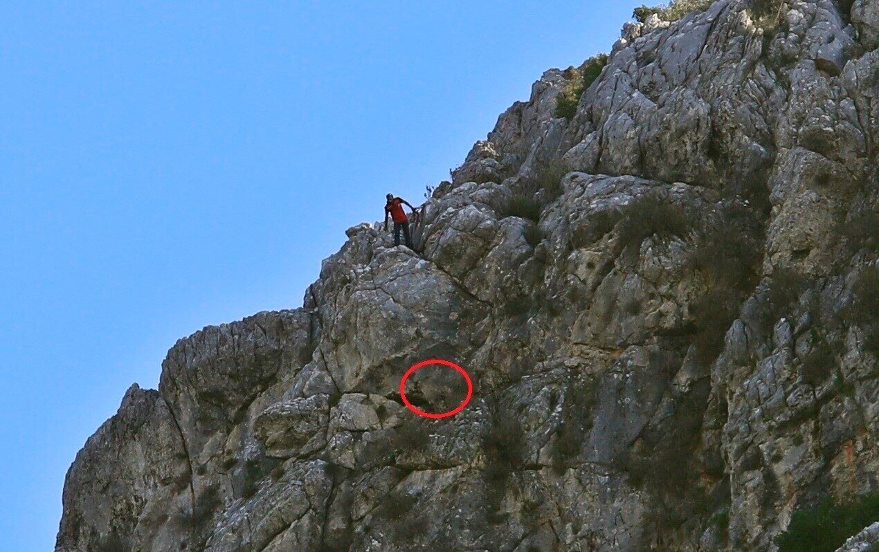 AFAD’tan gelen çağrı üzerine 12.00 civarında bölgeye ulaştık. Yerini amcamız söyledi. Dört keçiden üçünü kurtlar yemiş, bu da kendini can havliyle uçuruma atmış. 35 metrelik bir uçurumdaydı. Normal şartlarda oraya inmek mümkün değildi. İple erişim tekniğiyle indik, aç olmasından faydalanarak ot verip yanımıza çektik. Sonra bağlayıp aşağı indirip Bayram amcamıza teslim ettik. Keşke dördünü birden kurtarabilseydik. Bayram amcamız bu köyün garibanlarından, inşallah faydamız olmuştur.