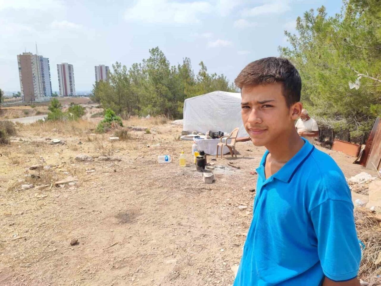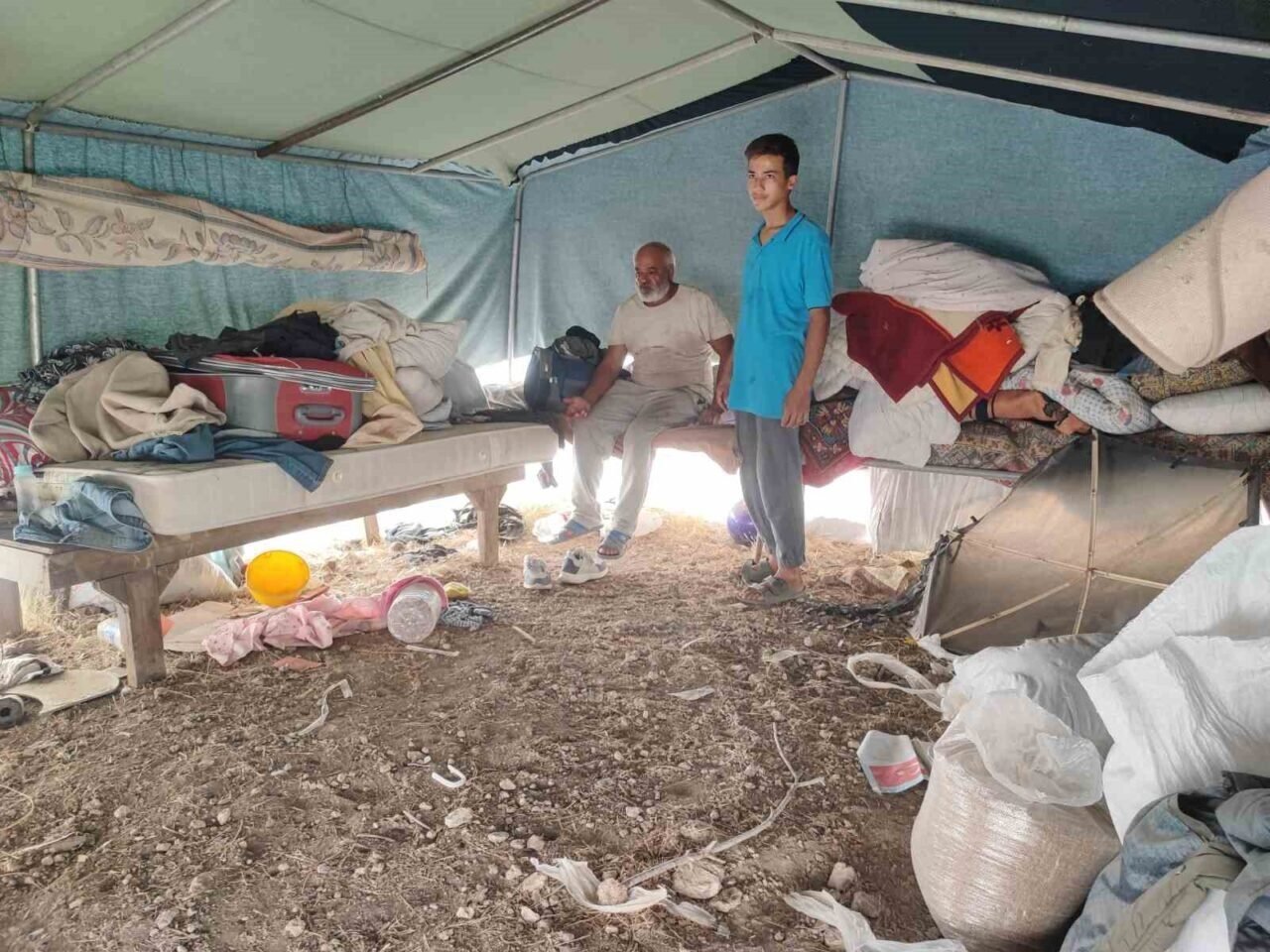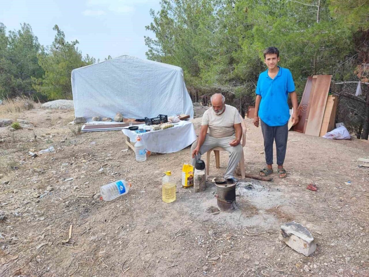 Bayram Güzeloğlu, “Ev sahibine aylık düzenli olarak 5 bin lira kiramı ödüyordum. Bir gün gelip evi sattığını söyleyip, evden çıkmamı istedi. Ben de gidecek yerim olmadığını söyleyince daha ay dolmadan beni sokağa attı. Çocukla birlikte çadır alıp, ormanlık alana çadır kurup, burada yaşamaya başladık. Hava çok sıcak, burada yaşamak çok zor oluyor ama mecbur kaldık” dedi.