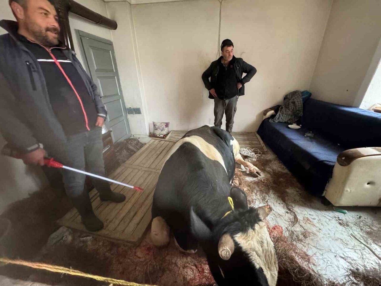 Komşular hızla bir araya gelerek salonda sıkışan hayvanı çıkarabilmek için yoğun çaba harcadı. Girdiği yerden dikkatlice çıkarılan tosun, daha sonra kamyona yüklendi ve kesime götürüldü. Olay sırasında kimsenin yaralanmaması büyük bir teselli oldu.
