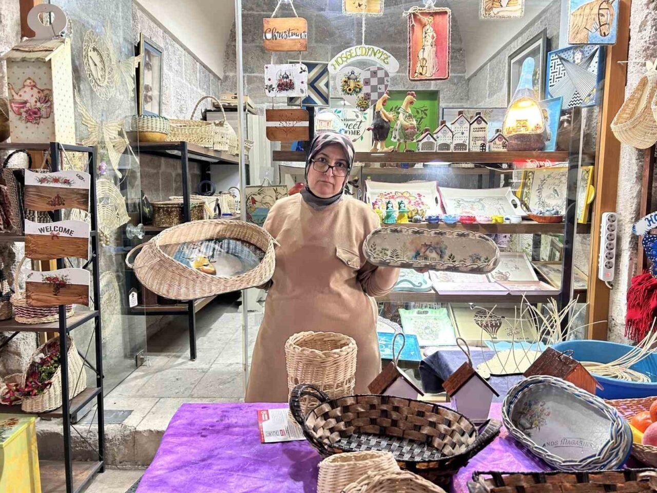 El emeği tepsi ve sepet sattığını dile getiren 54 yaşındaki Rauda Filge, “Yaklaşık 4 yıldır sepet ve ahşap tepsi yapıyorum. Kadın olarak dükkanımızı açmamız çok güzel bir his, bir insanın bir şey öğrenip satmaya başlayınca farklı bir his oluyor. Külliyede iş yerimize gelen yabancıları sepetlerimizi satıyoruz hem Arapça hem de İngilizce olarak sepetlerimizi sunuyoruz” dedi.