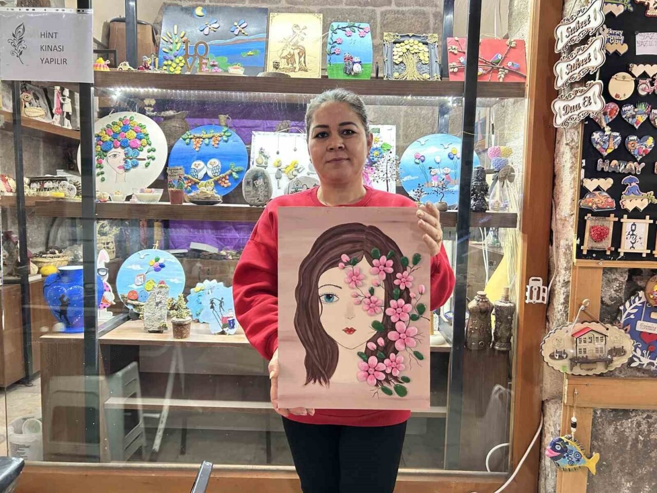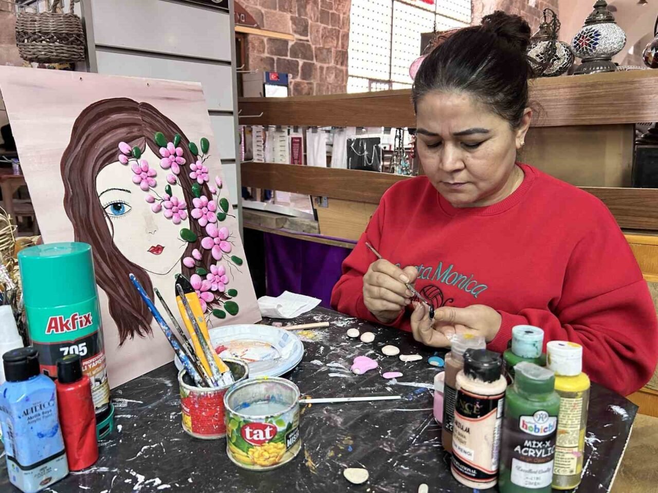 Sokullu Mehmet Paşa Külliyesi’ndeki iş yerinde taş boyama sanatıyla gelir sağlayan 47 yaşındaki Zübeyde Ersan, “Taş boyama sanatına yaklaşık 15 yıl önce hobi olarak başladım, kendime dinlenme olarak ayırdığım vakitlerde yapıyordum. Farklı alanlarda taş boyama yapıyorum. Kapı önü tutmalıklar, panolar, nihaleler ve taş boyamayla ilgili özel günlere ait özel tasarımlar yapıyorum. Kısacası şöyle söyleyebilirim ekmeğimi taştan çıkarıyorum” şeklinde konuştu.