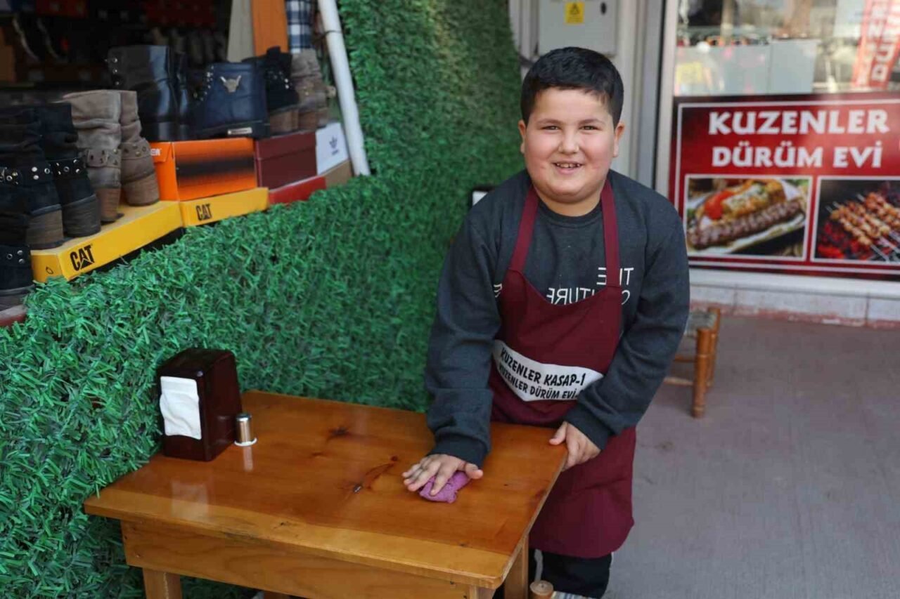Okulların tatil olmasıyla birlikte kebapçıda çıraklık yapmaya başladığını dile getiren 9 yaşındaki Adem Şölen, müşterilerin kendini severek bahşiş verdiğini ifade edere “Ben burada çalışıyorum. Tabakları kaldırıyorum. Yerleri süpürüyorum ve siliyorum. Masaları topluyorum. Kebapları çeviriyorum. Ustalar bir şey istediğinde yardım ediyorum. Burayı çok seviyorum. Bu işi çok seviyorum. Büyüdüğümde polis olmak istiyorum. İlerde de dükkan açabilirim. 3’üncü sınıfa gidiyorum. Okullar tatil olduğunda burada çalışıyorum. Müşteriler beni görünce aferin diyorlar ve bana bahşiş veriyorlar. İşler kolay çünkü bu işi seviyorum” dedi.