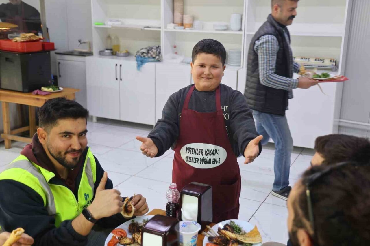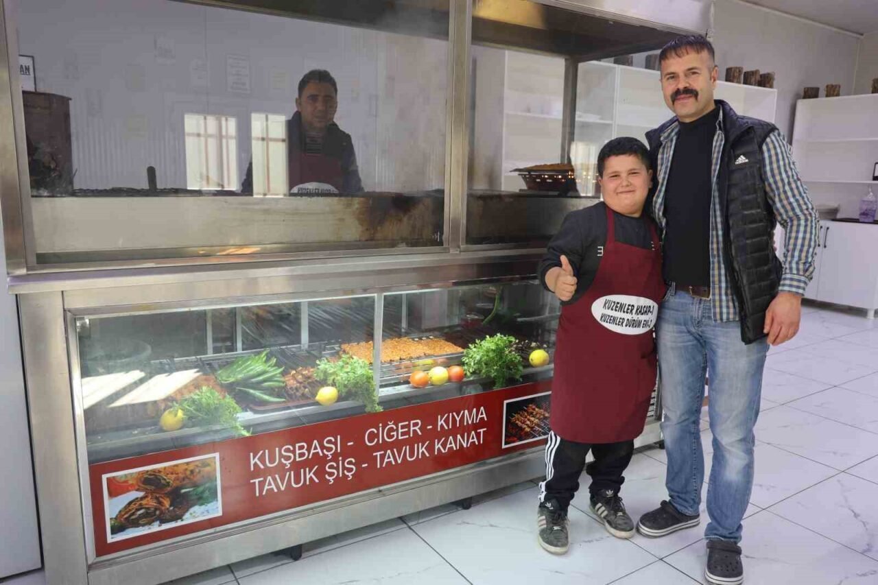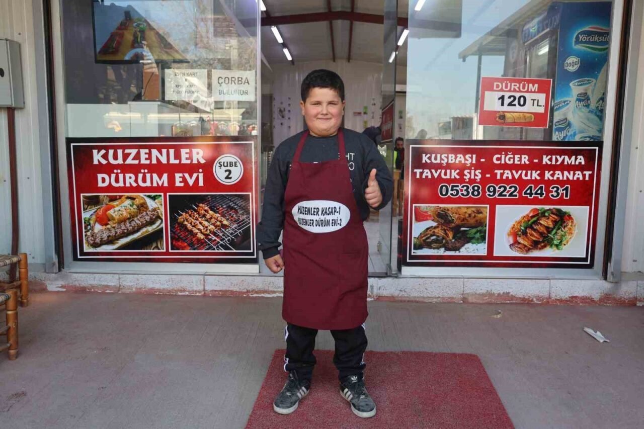 HATAY’DA YARIYIL TATİLİNİ BİR KEBAPÇIDA ÇIRAKLIK YAPARAK GEÇİREN 9 YAŞINDAKİ ADEM ŞÖLEN, KENDİNE HAS ‘KEBABA GEL, CİĞERE GEL’ DEĞİŞİYLE MÜŞTERİLERİN YÜZÜNÜ GÜLÜMSETİYOR.