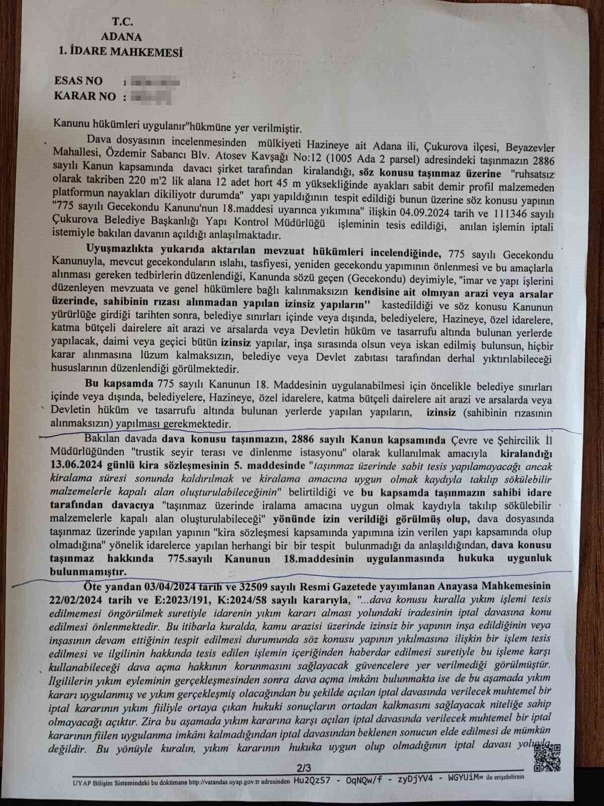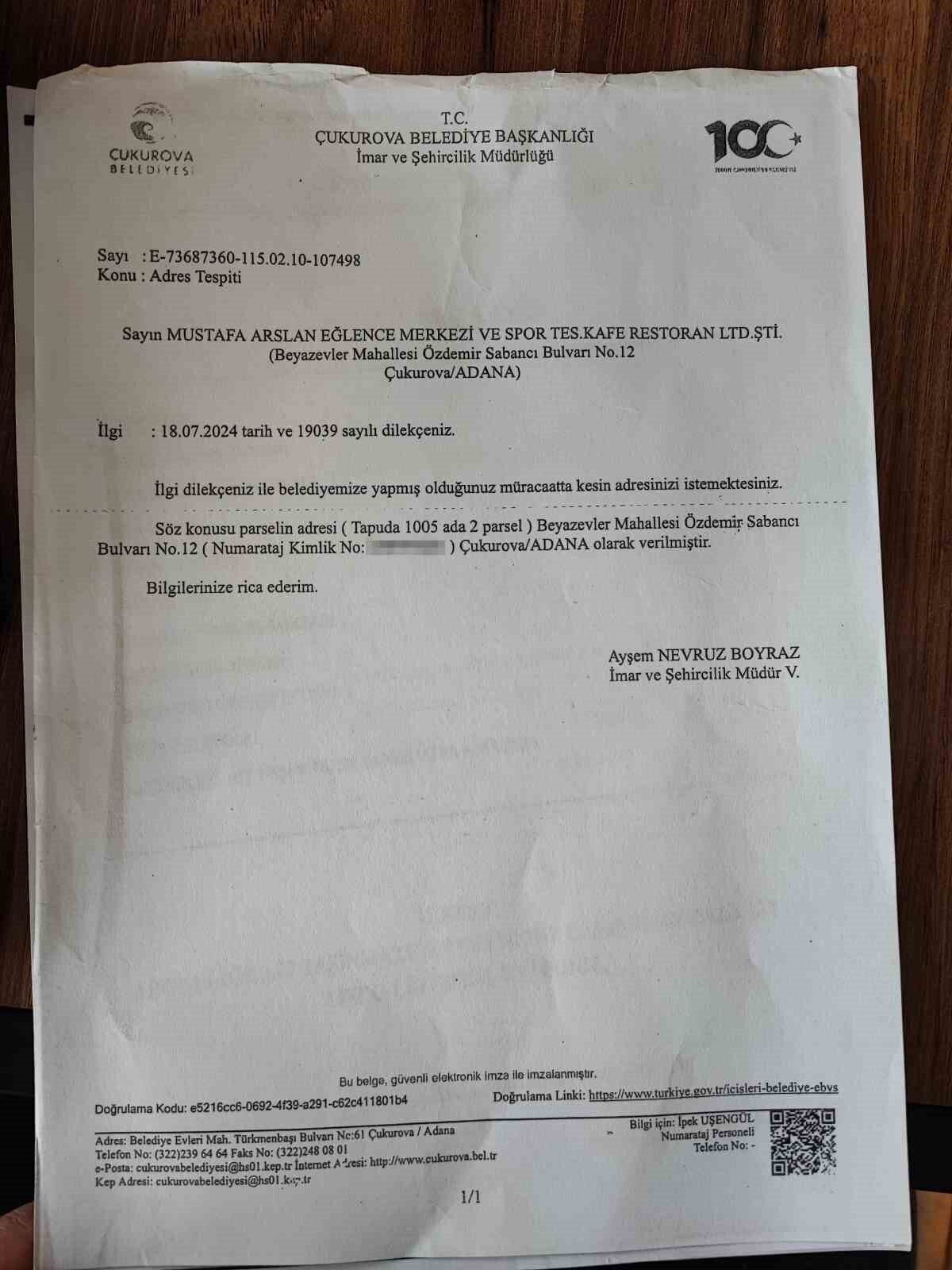 “Burası için imara aykırı diyorlar. Ama ASKİ yani belediye imara aykırı yapıya nasıl su aboneliği verdi. Etrafta benzer bir sürü yapı var. Onlara neden yıkım kararı çıkmıyorda bize çıkıyor. Bunlar hepsi bilinçli yapılan şeyler. Hem Çukurova hem de büyükşehir belediyesi bilinçli olarak bizim 3 yıllığına kiraladığımız tesisimizi yıkmaya çalışıyor. Bizim bu yapı için gerekli olan her yerden iznimiz var. Ben burayı çevre şehircilikten seyir terası yapacağım diye kiraladım. Benim bütün evraklarım var her şey hukuki. Hukuksuzluk yapan büyükşehir ve Çukurova Belediyesidir.”