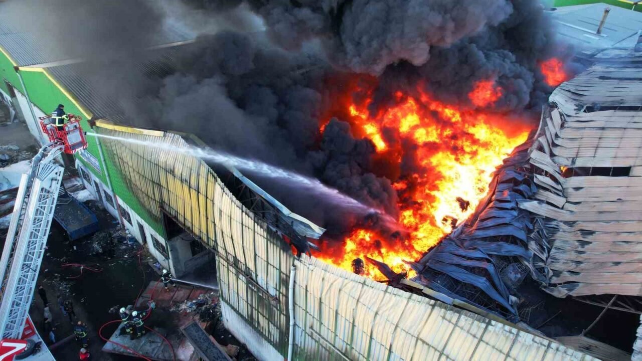 Adana’da geri dönüşüm fabrikasındaki yangın havadan görüntülendi