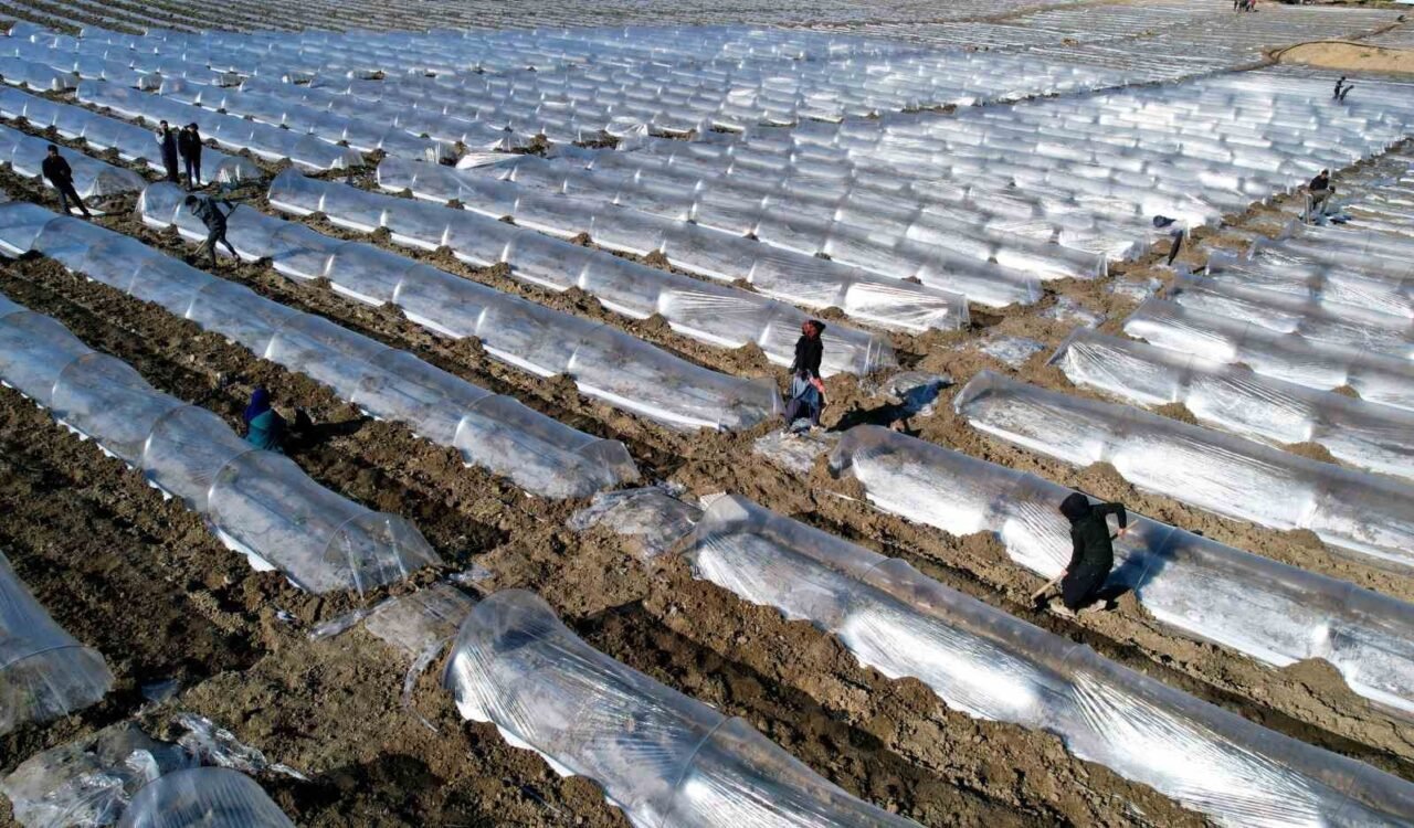 İşçilerin bazıları toprağı düzeltirken, bazıları fide çukurlarına gübre yerleştirdiği toprağı, fide ekimine hazır hale getirdi. Binbir emekle fideler toprakla buluşurken soğuktan korumak için üstlerini naylonla kapattı.