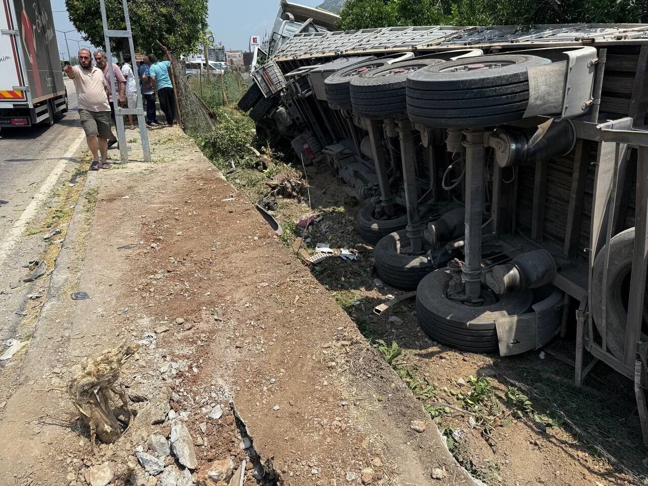 KAZADA BAHÇEYE DEVRİLEN TIRIN SÜRÜCÜSÜ SIKIŞTIĞI YERDEN GÜÇLÜKLE ÇIKARILDI.