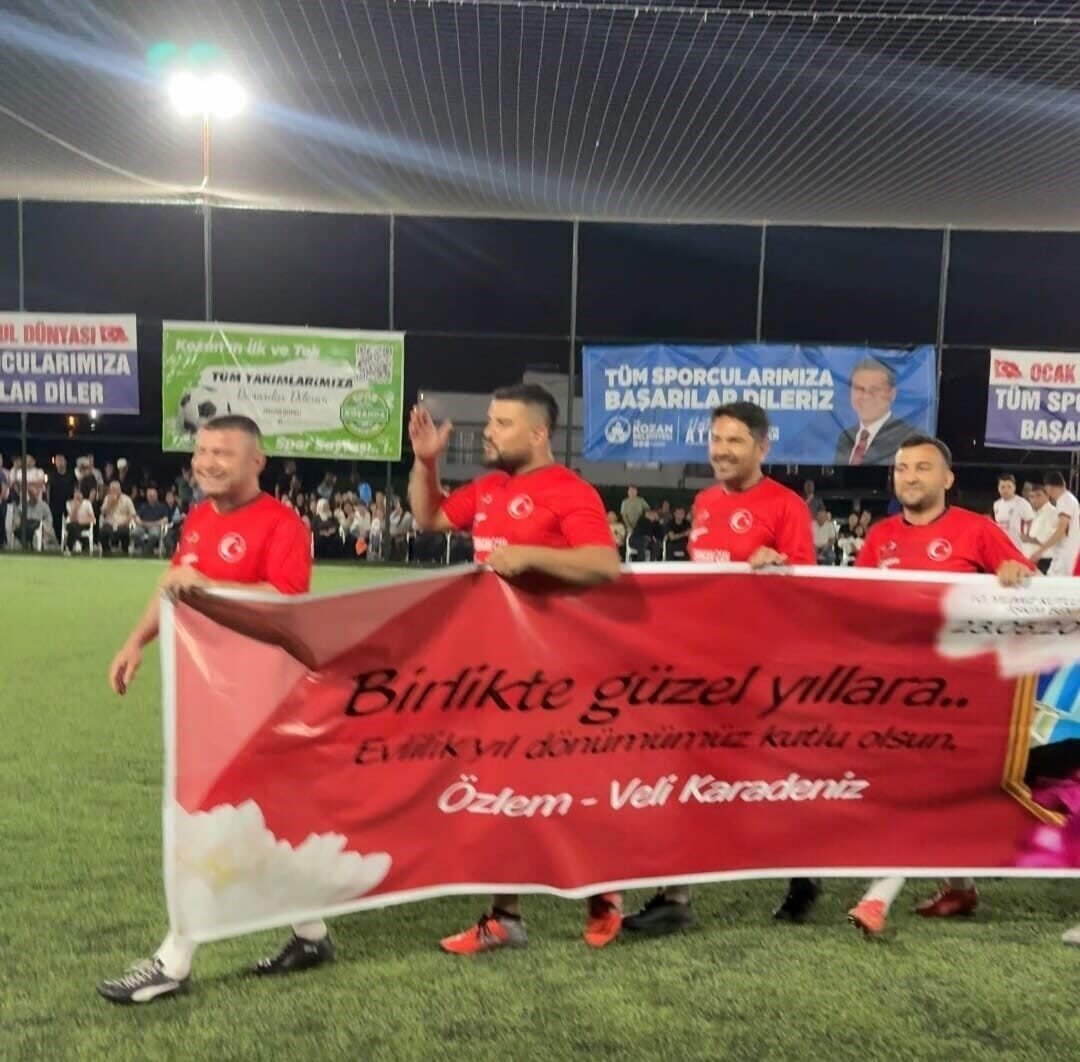 Adana’nın Kozan ilçesinde öğretmen olarak görev yapan Veli Karadeniz’in belediyenin düzenlediği turnuvadaki maçı evlilik yıl dönümüne denk geldi. Karadeniz, maçta sahaya takım arkadaşları ile “Birlikte evlilik yıl dönümüz kutlu olsun” yazılı pankartla çıktı. İki çocuk babası olan Karadeniz, eşine hazırladığı süprizle büyük alkış aldı.
