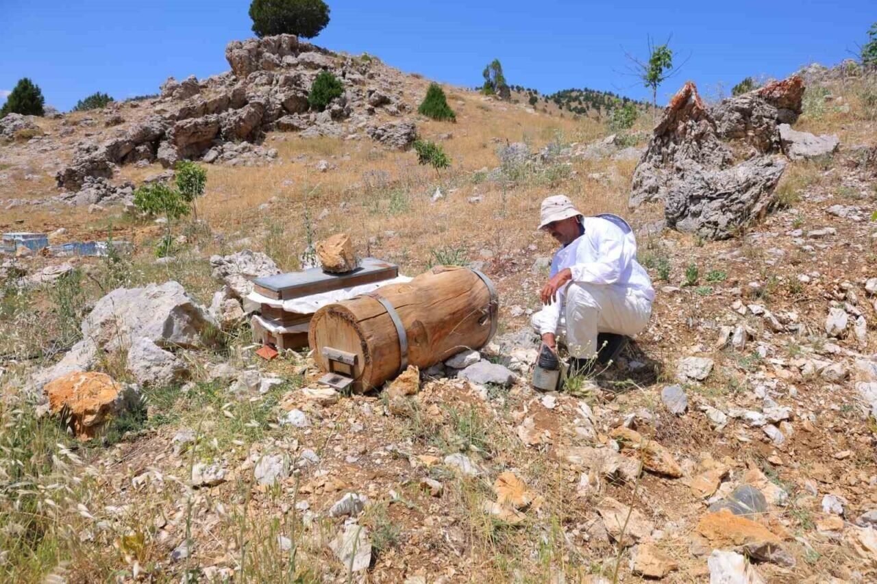 Kahramanmaraş’ın Engizek Yaylası’nda arıcılık yapan üretici, kovanlarının yanına bıraktığı boş bir ağaç kütüğünde doğal ortamda bal üretti.