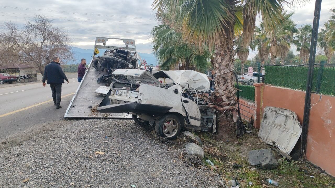 HATAY’IN ERZİN İLÇESİNDE PALMİYE AĞACINA ÇARPARAK İKİYE BÖLÜNEN TOFAŞ’IN SÜRÜCÜSÜ YARALANDI. FECİ KAZAYSA AN BE AN GÜVENLİK KAMERASINA YANSIDI.