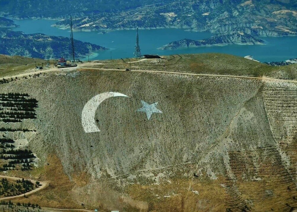 Onikişubat Belediyesi tarafından Ahır Dağı’nın zirvesine dünyanın en büyük Türk bayrağı nakşediliyor. 38 bin metrekarelik alan üzerine işlenen dev Türk bayrağının yanı sıra, 6 bin metrekarelik kırmızı zemin üzerine altın sarısı şeritli İstiklal Madalyasının da yer alacağı belirtildi. Yapımı devam eden projenin, tamamlandığında Kahramanmaraş şehir merkezinin birçok noktasından da görülebileceği ifade edildi. Bayrağın çizim, zemine uygulama ve boya çalışmaları sürerken, tamamlandığında hem estetik hem de tarihi yönüyle şehre değer katması hedeflendiği kaydedildi. Onikişubat Belediyesinin koordinasyonunda yürütülen çalışmanın, yaz ayları içinde tamamlanması planlanıyor.