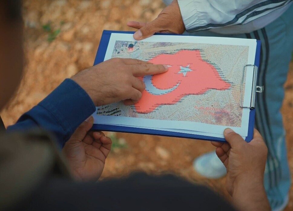 Kahramanmaraş’ta dünyanın en büyüğü olarak 38 bin metrekarelik Türk bayrağı ile 6 bin metrekarelik İstiklal Madalyası ’Ahur Dağı’ zirvesine işleniyor.