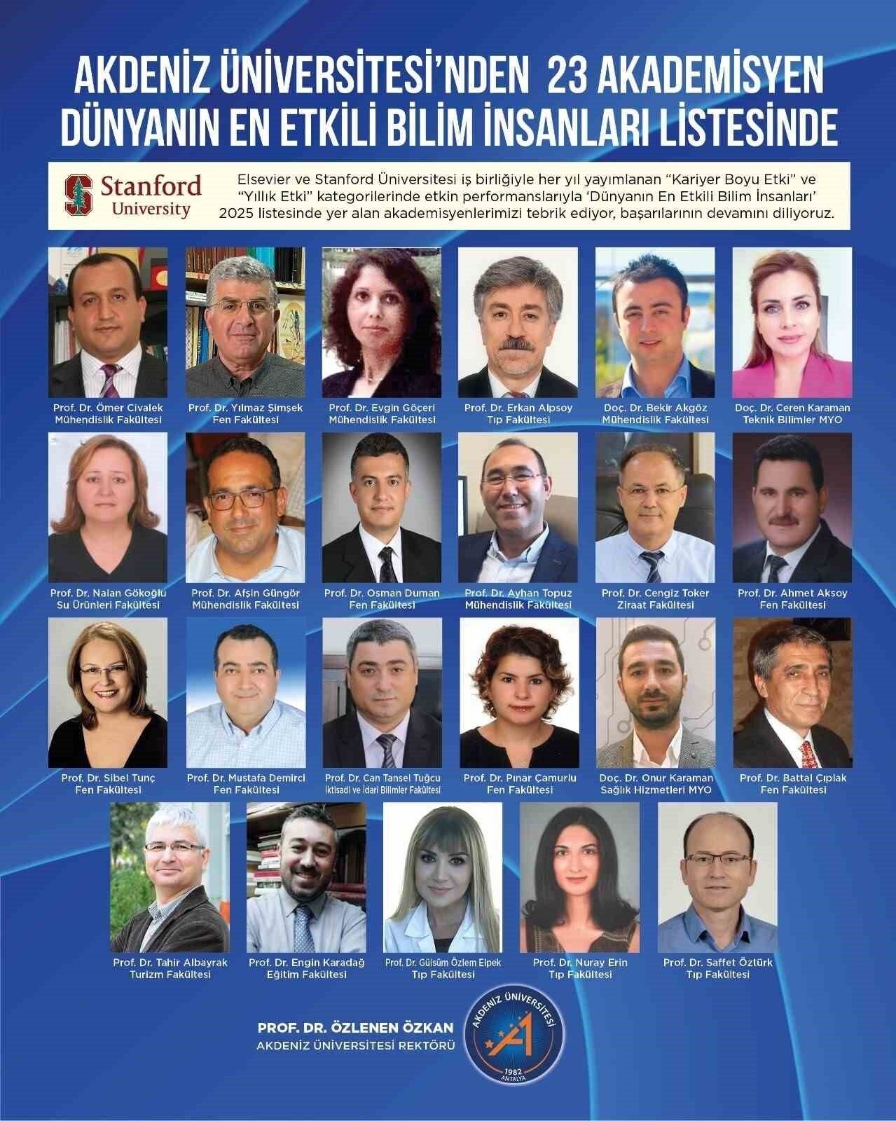 Antalya Elsevier ve Stanford Üniversitesi’nce her yıl yayımlanan “Dünyanın En Etkili Bilim İnsanları” 2025 listesi açıklandı. Dünya genelinde 22 anabilim dalı ve 174 alt bilim dalından 200 bini aşkın bilim insanı arasından, en az 5 yayına sahip ve c-score sıralamasında ilk 100 bin’e giren ya da kendi alanında ilk yüzde 2’lik dilime ulaşan araştırmacılar değerlendirildi. Akdeniz Üniversitesi’nden toplam 23 akademisyen, “Kariyer Boyu Etki” ve “Yıllık Etki” kategorilerinde gösterdikleri bilimsel performans ile listeye girmeyi başardı. Atıflar, H-indeks, Hm-indeks, C-skoru ve yazar sırasına bağlı atıf gibi kriterlerin dikkate alındığı sıralamada, üniversite “Kariyer Boyu Etki” kategorisinde 18, “Yıllık Etki” kategorisinde ise 18 akademisyenle yer aldı.