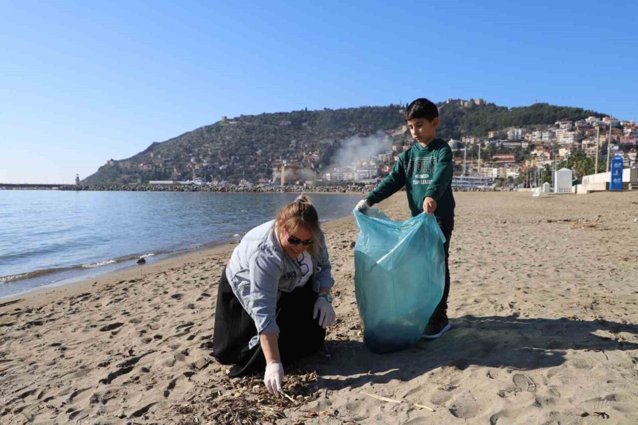 Alanya Belediye Başkanı Osman Tarık Özçelik ile birlikte sahil temizliği yapan Belediye Rüya İpekten ve Saadet Çelik Kreş ve Çocuk Akademisi öğrencileri, ‘Bu Dünya Hepimizin’ mesajı verdiler.