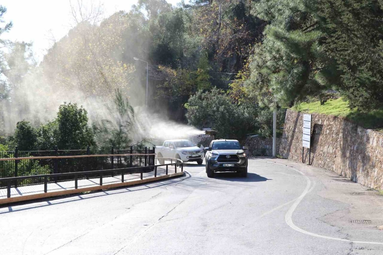 Antalya’nın Alanya ilçesinde yeşil alanlarda çam kese böceğine karşı ilaçlama çalışması yapıldı.