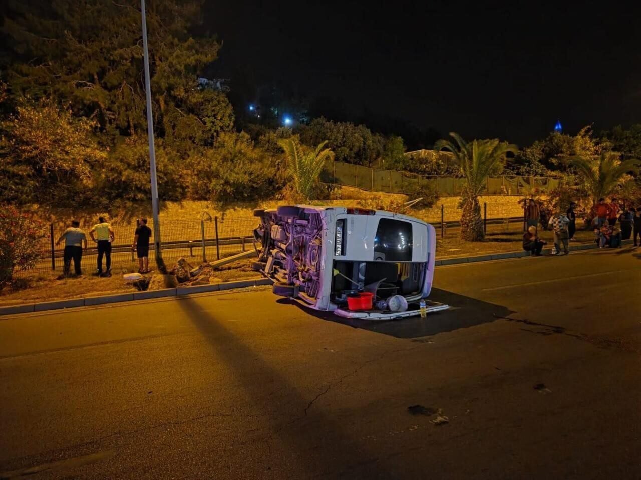 Alanya’da aydınlatma direğine çarpan minibüs devrildi