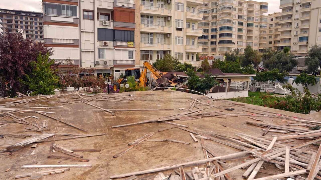 Alanya Belediyesi’ne ait 862 metrekarelik alanı işgal eden restoran ve restorana ait yapılaşma tamamen yıkılarak alan temizlendi. Tosmur Mahallesi D-400 Karayolu üzeri Tosmur Kavşağı batısı 3. Sokak’taki alanın, imar planında park alanı olarak ayrıldığı belirlendi.