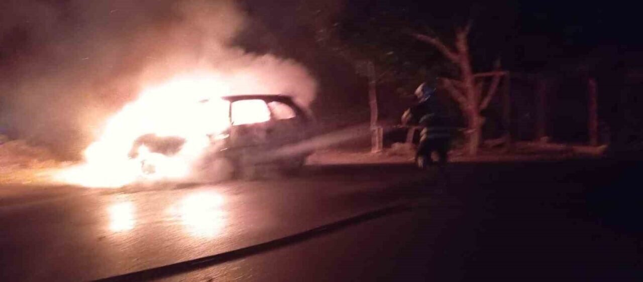 Hatay’da alevlere teslim olan otomobil yanarak kullanılmaz hale geldi.