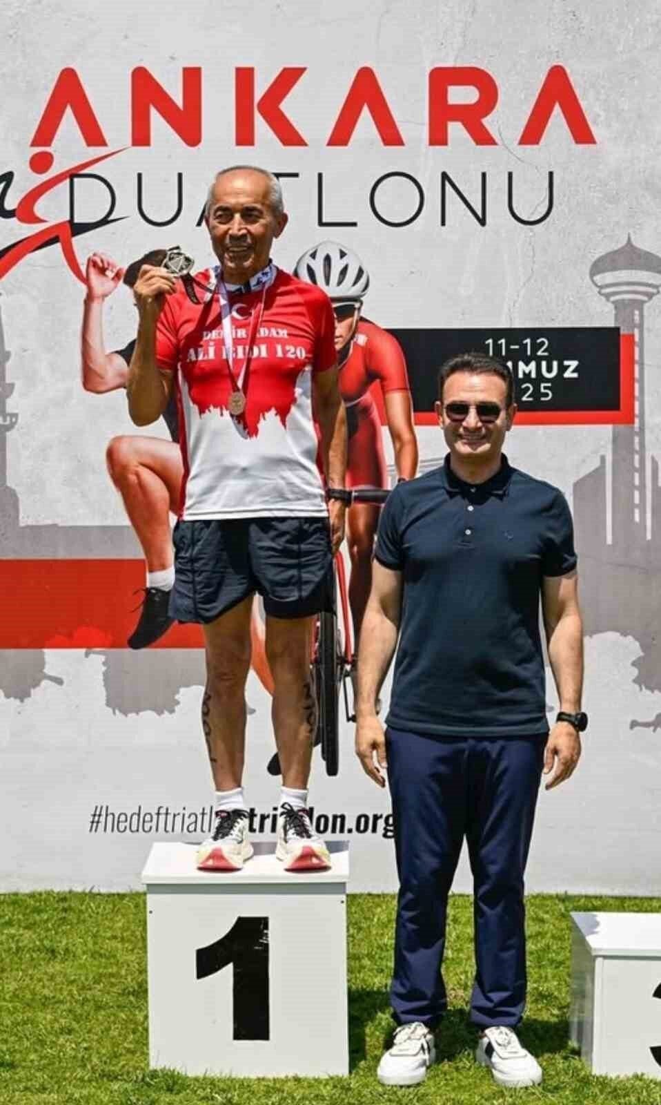 Antalya’dan yarışlara katılan ‘Demir Adam’ lakaplı milli sporcu ve iş insanı Ali Bıdı, 75-79 Yaş Grubu kategorisinde mücadele verdi. Önce 5 km koşan, ardından 20 km bisiklet süren Bıdı, 2,5 km daha koştuktan sonra parkuru 1 saat 47 dakika 20 saniyede tamamlayarak birincilik kürsüsüne çıktı. ‘Demir Adam’ ayrıca Konya, İzmir ve Ankara’da yapılan yarışlarda elde ettiği başarıdan dolayı Türkiye Kupası’na layık görüldü. Bıdı ödüllerini, Türkiye Triatlon Federasyonu Başkanı Bayram Yalçınkaya’nın elinden aldı. Ali Bıdı’nın başkentteki performansı hem sporcular, hem de izleyenler tarafından büyük alkış topladı. Toplam altı farklı kategoride düzenlenen 2025 Ankara Duatlonu, her yaştan ve performans düzeyinden sporcuya hitap eden yapısıyla dikkat çekti. Etkinlik, triatlon sporunun Türkiye’deki gelişimine katkı sağlayan önemli organizasyonlardan biri olarak öne çıktı.