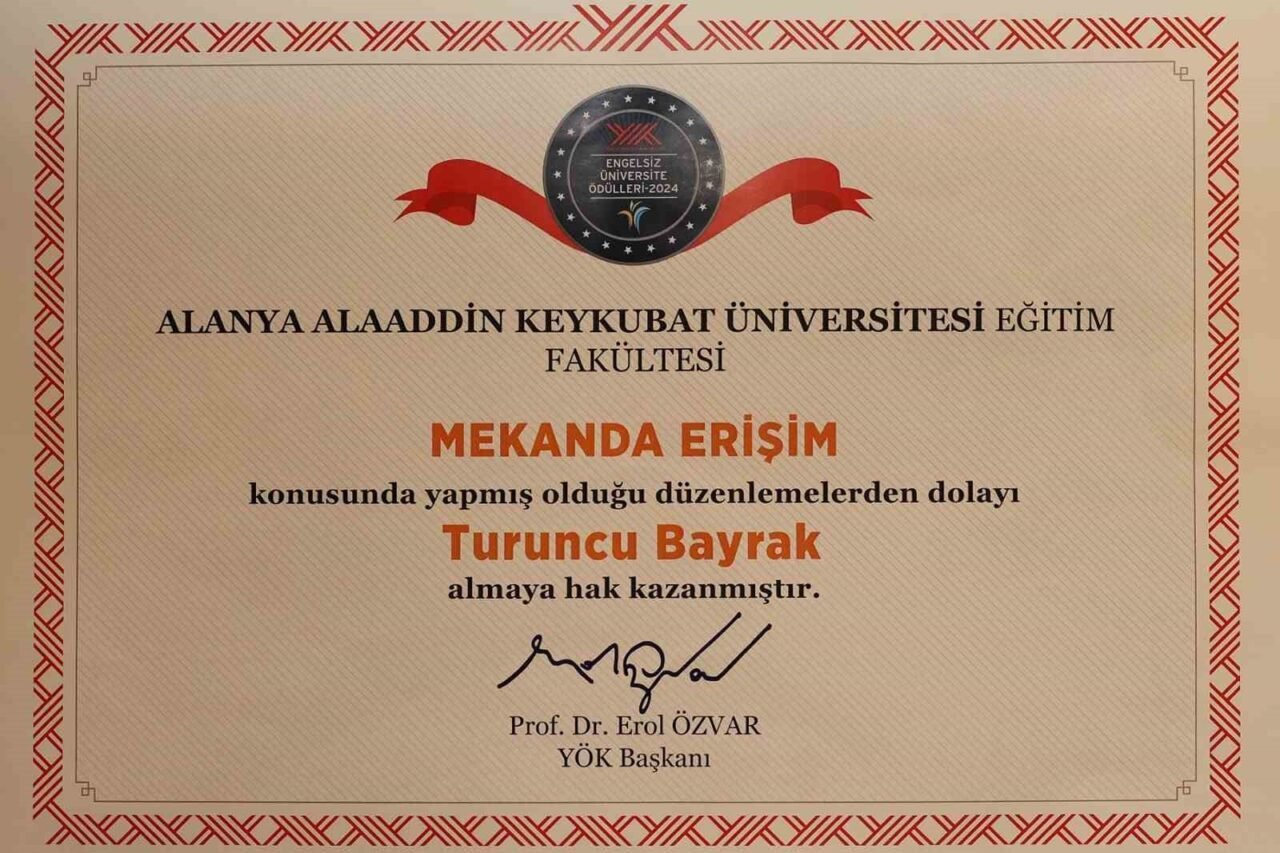 Alanya Alaaddin Keykubat Üniversitesi (ALKÜ) Eğitim Fakültesi, engelli bireylerin eğitim ve kampüs yaşamına tam katılımını sağlamak adına yürüttüğü çalışmalarla “Turuncu Bayrak” ödülüne layık görüldü.
