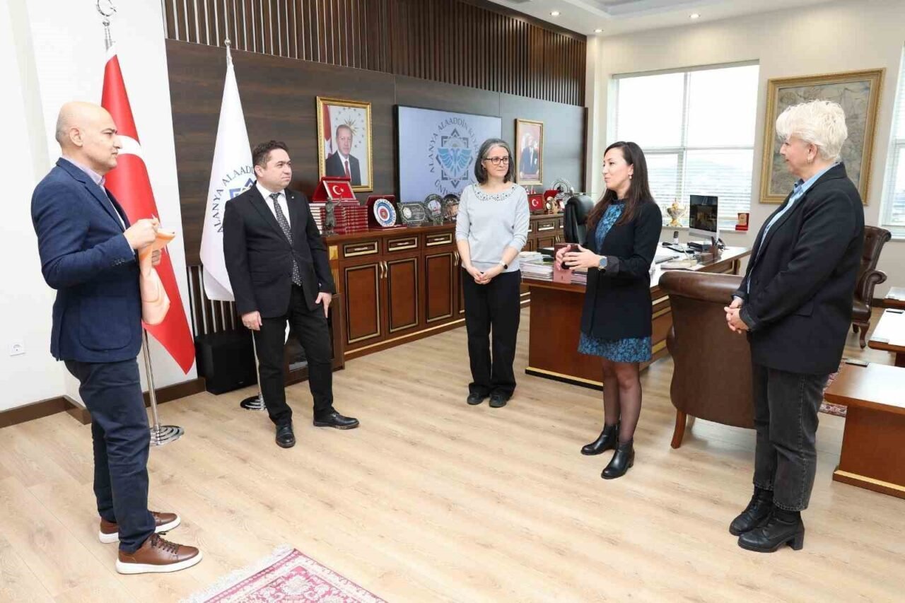 Eğitim Fakültesi Dekanı Prof. Dr. Mustafa Uslu beraberinde, Engelli Öğrenci Koordinatörü Dr. Öğr. Üyesi Seher Ülker, Hizmetlere Erişim Birim Koordinatörü Gülsiye Bıçak, Doç. Dr. Ayşe Yenilmez Türkoğlu ile ALKÜ Rektörü Prof. Dr. Kenan Ahmet Türkdoğan’a Turuncu Bayrak’ı ve belgeyi takdim ettiler.
