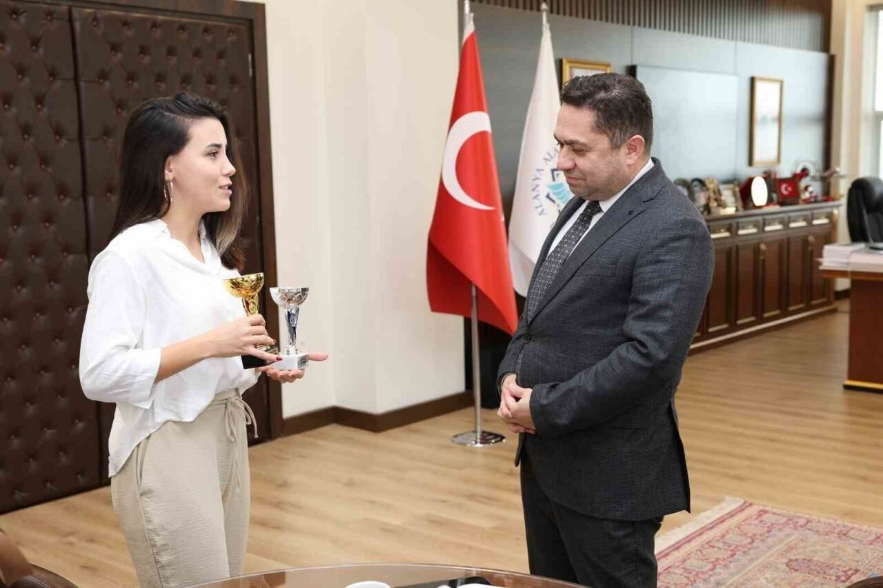 Juna Cup 2025 Uluslararası Artistik Buz Pateni Yarışması’nda iki kategoride birinci olan Alanya Alaaddin Keykubat Üniversitesi (ALKÜ) Eğitim Fakültesi İngiliz Dili Eğitimi Ana Bilim Dalı Arş. Gör. Gökçen Bahadır, ALKÜ Rektörü Prof. Dr. Kenan Ahmet Türkdoğan’ı ziyaret etti.