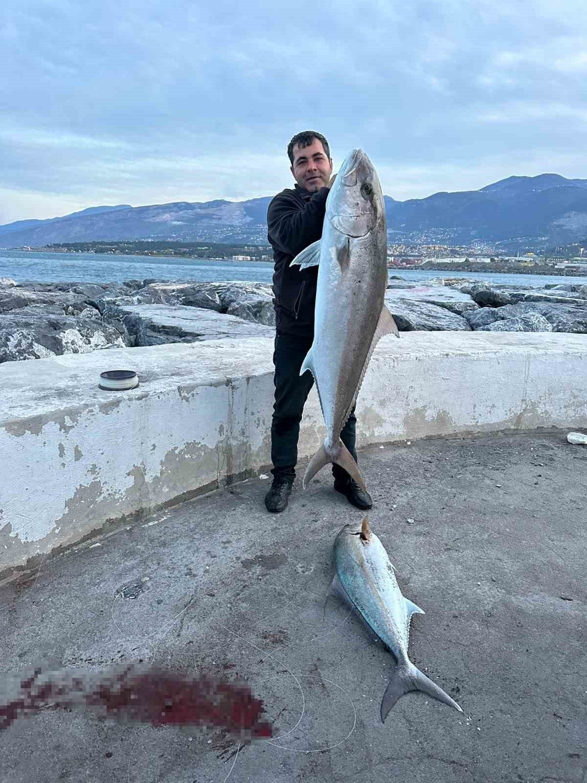 HATAY’DA İSKENDERUN KÖRFEZİ’NDE AMATÖR BALIKÇI VOLKAN SUĞURTİN, 1 METRE UZUNLUĞUNDA VE TOPLAM 50 KİLOGRAM AĞIRLIĞINDA İKİ BALIĞI TEK SEFERDE AYNI OLTAYLA 1 BUÇUK SAATTE YAKALAMAYI BAŞARDI.
