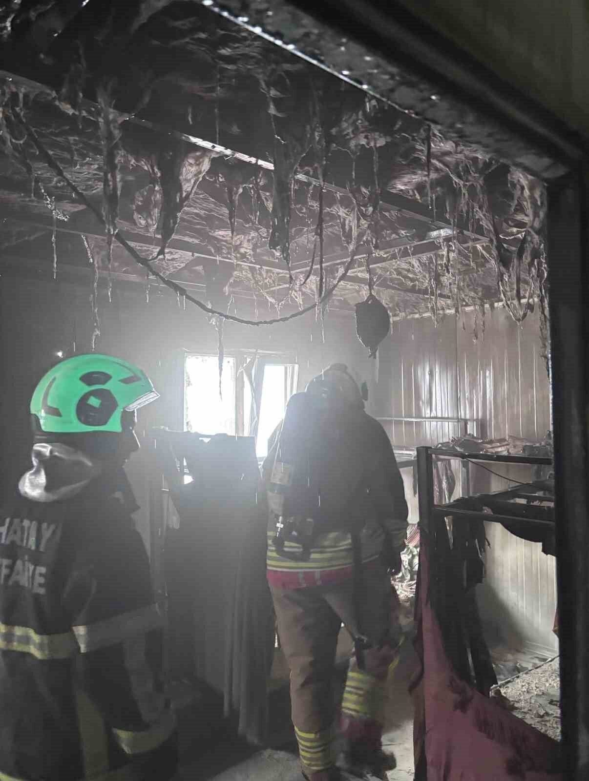 Hatay’da şantiye alanında bulunan konteyner yatakhanede çıkan yangında konteynerler zarar gördü.