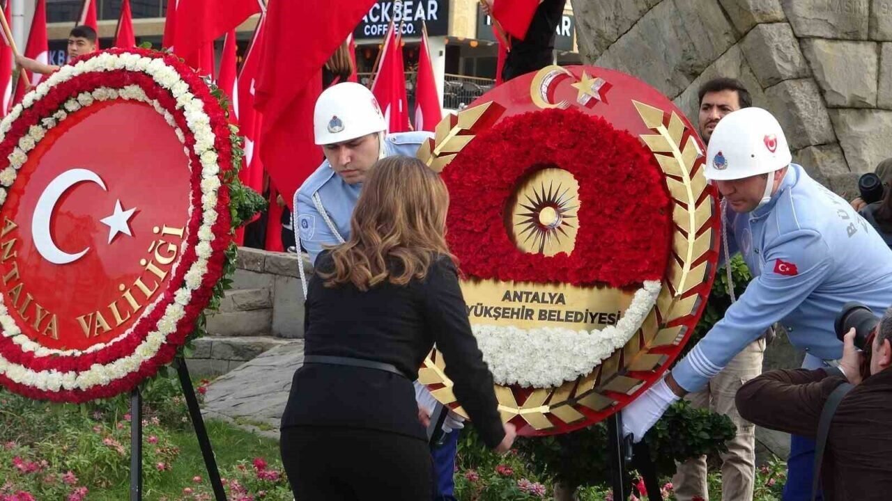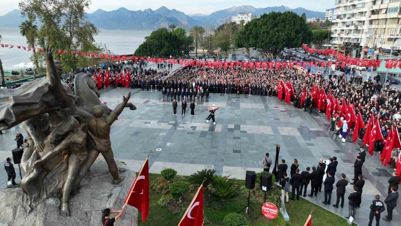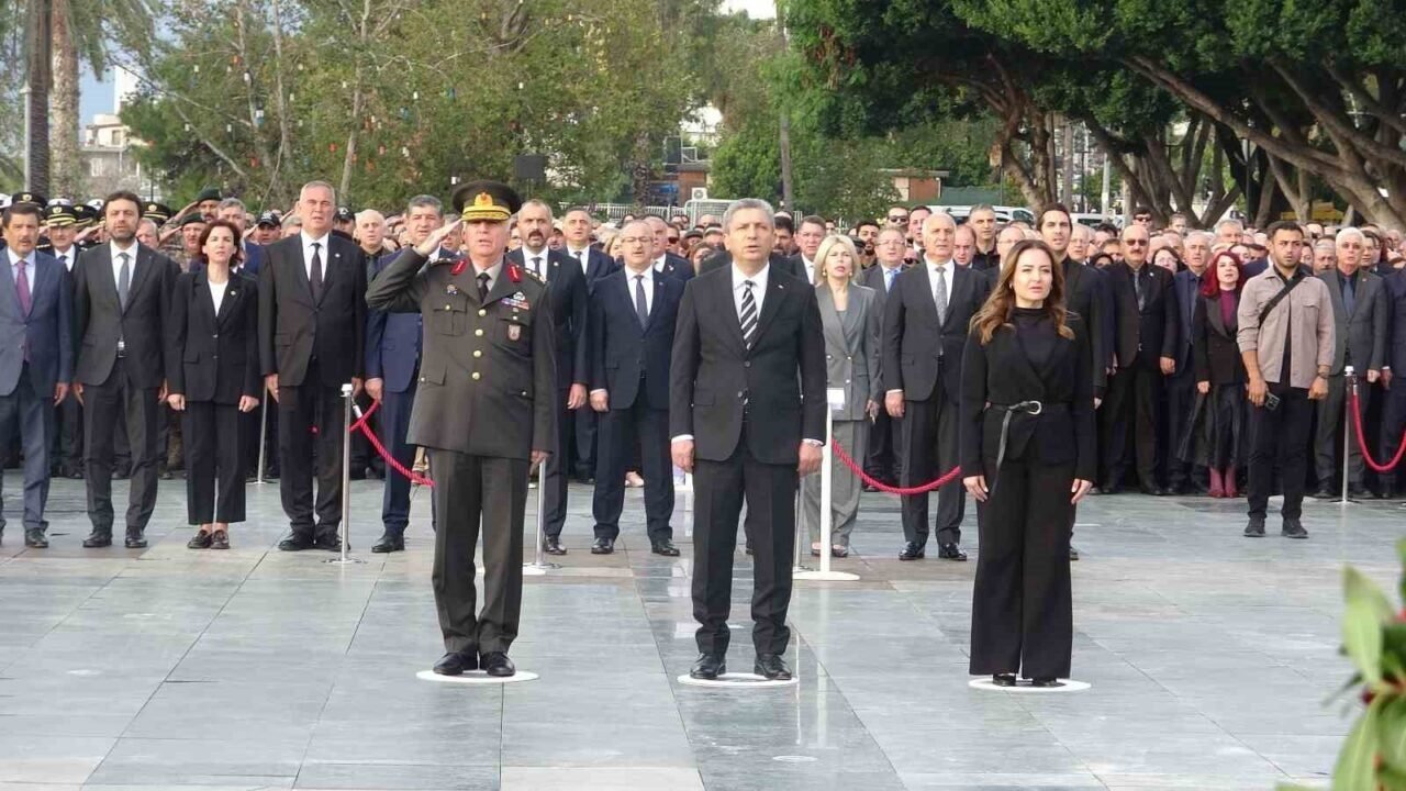 Antalya Valiliği tarafından düzenlenen resmi törende, Atatürk Anıtı’na çelenk sunuldu. Sabahın erken saatlerinden itibaren meydanı dolduran vatandaşların büyük bölümü, Atatürk portreli tişörtler giydi. Bazı vatandaşlar ellerinde Türk bayraklarıyla, bazıları ise göğsünde Atatürk rozetiyle törene katılırken, saatler 09.05’i gösterdiğinde kentte hayat adeta durdu; araçlar korna çaldı, vatandaşlar saygı duruşuna geçti. Saygı duruşunun ardından hep birlikte İstiklal Marşı okundu, Türk bayrağı yarıya indirildi. Duygusal anların yaşandığı törende, kimi vatandaşların gözyaşlarını tutamadığı görüldü.