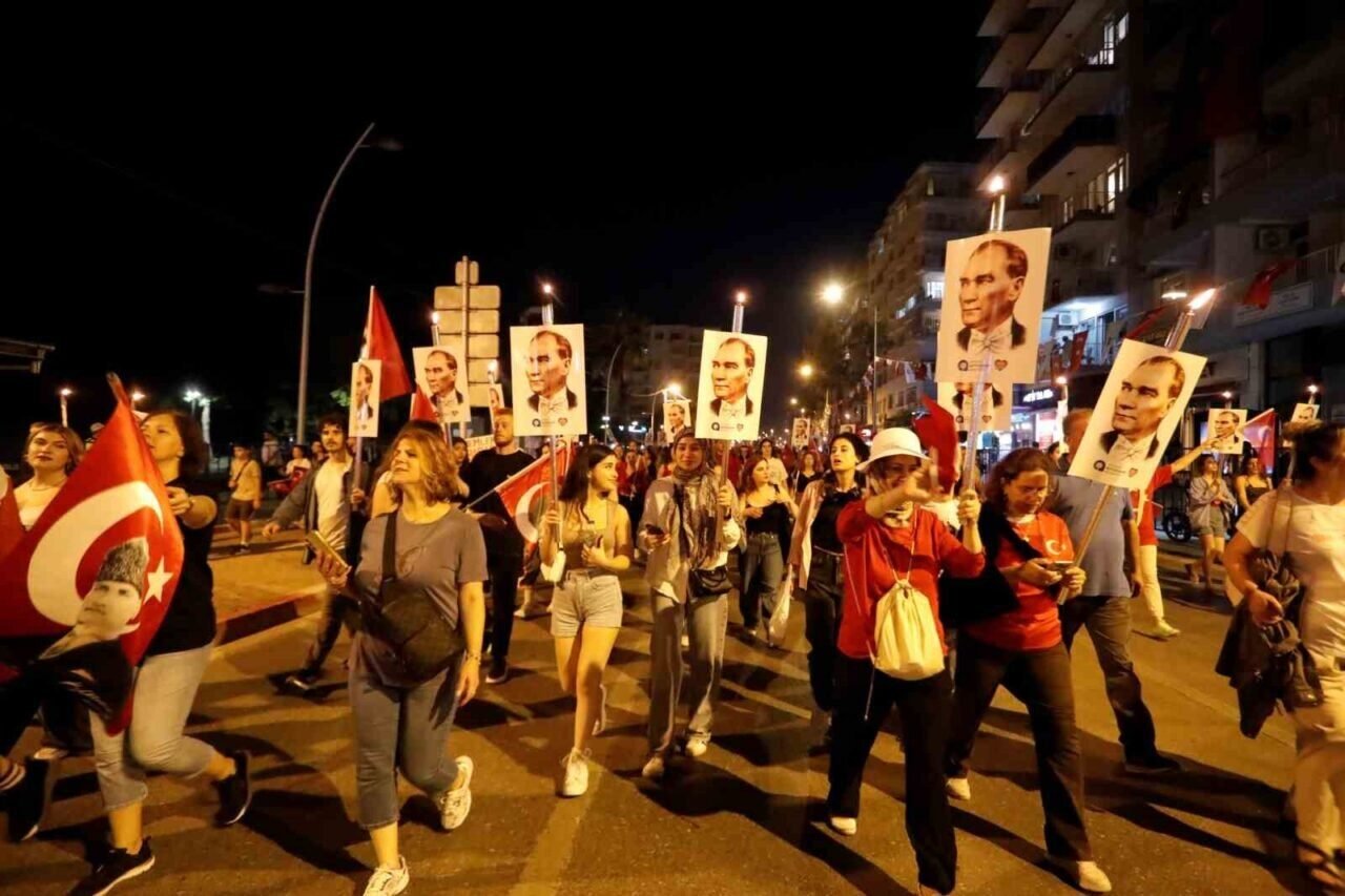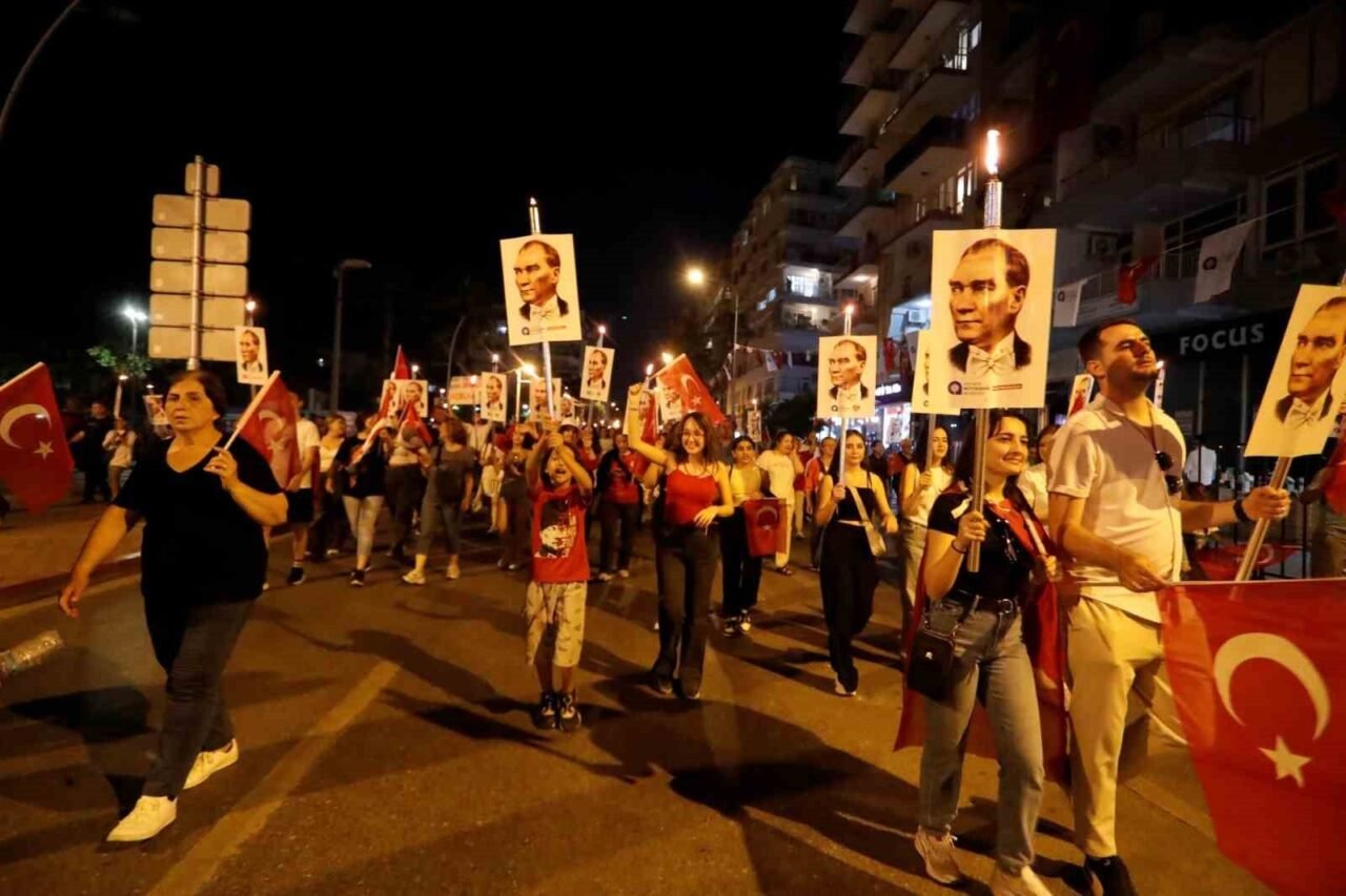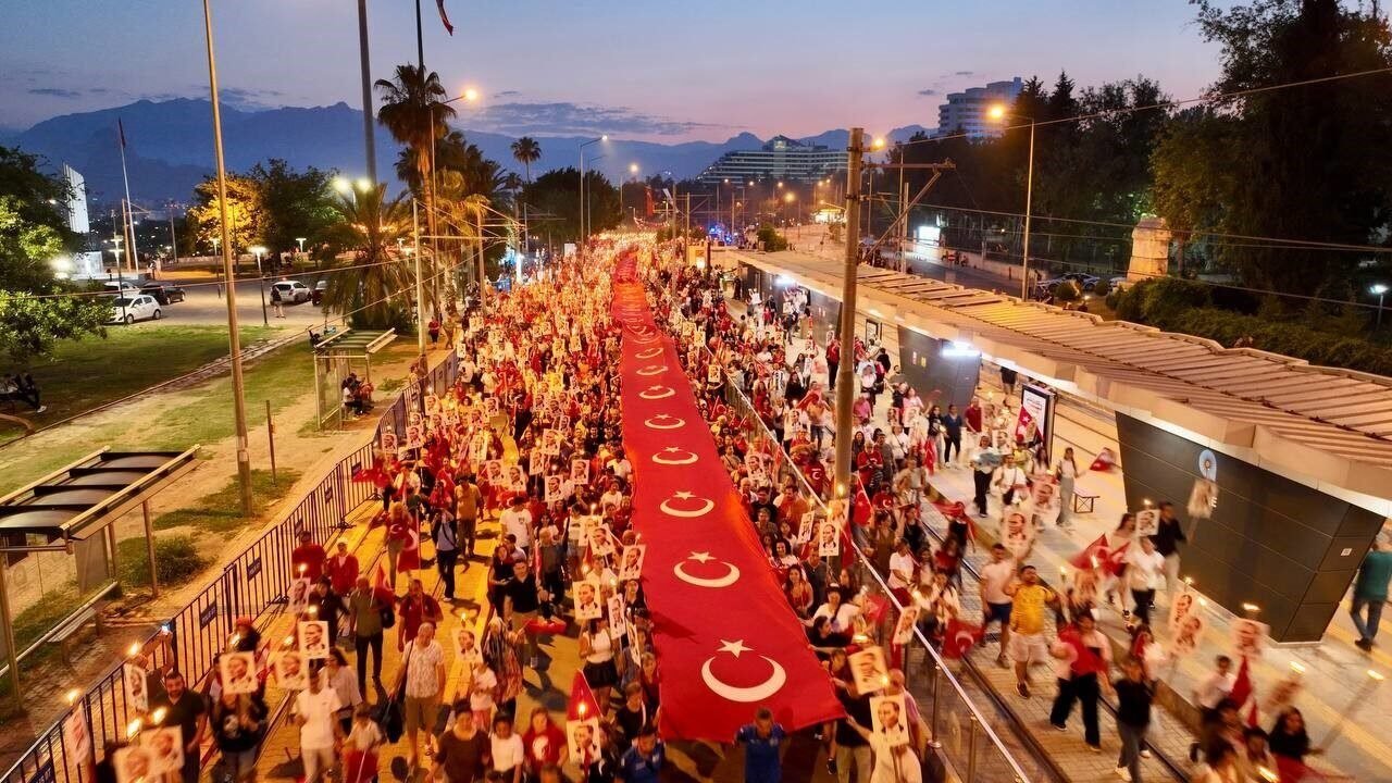 Binlerce kişi akşam saatlerinde ellerinde Türk bayrakları ve Atatürk fotoğrafları ile Fener Alayı’nın başlangıç noktası olan Konyaaltı Varyant’ta toplanmaya başladı. Antalya Valisi Hulusi Şahin, Antalya Büyükşehir Belediye Başkanı Muhittin Böcek, 3. Piyade Eğitim Tugay Komutanı Piyade Albay Hüseyin Yılmaz, Muratpaşa Kaymakamı İhsan Kara, STK temsilcileri ve çok sayıda vatandaşın katıldığı yürüyüşte 400 metrelik dev Türk bayrağı taşındı. Fener Alayı’na Türk Hava Kurumu’na bağlı paramotorcular gökyüzünden eşlik ederken, yürüyüş güzergahındaki apartmanların balkonlarındaki vatandaşlar da alkışlarıyla destekledi. 7’den 70’e binlerce Antalyalı, ellerinde Türk bayraklarıyla sloganlar ve marşlar eşliğinde Cumhuriyet Meydanı’na kadar yürüdü.