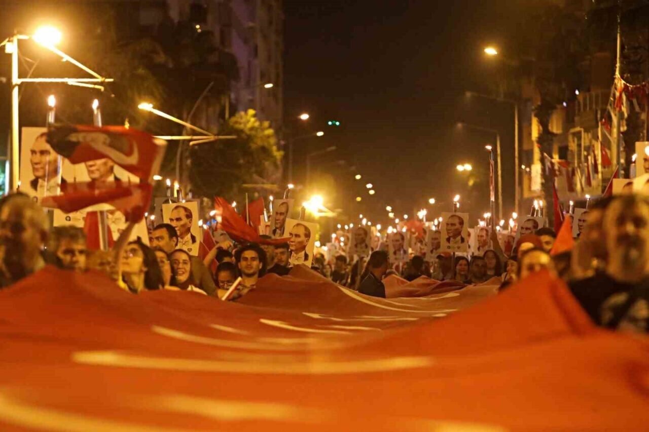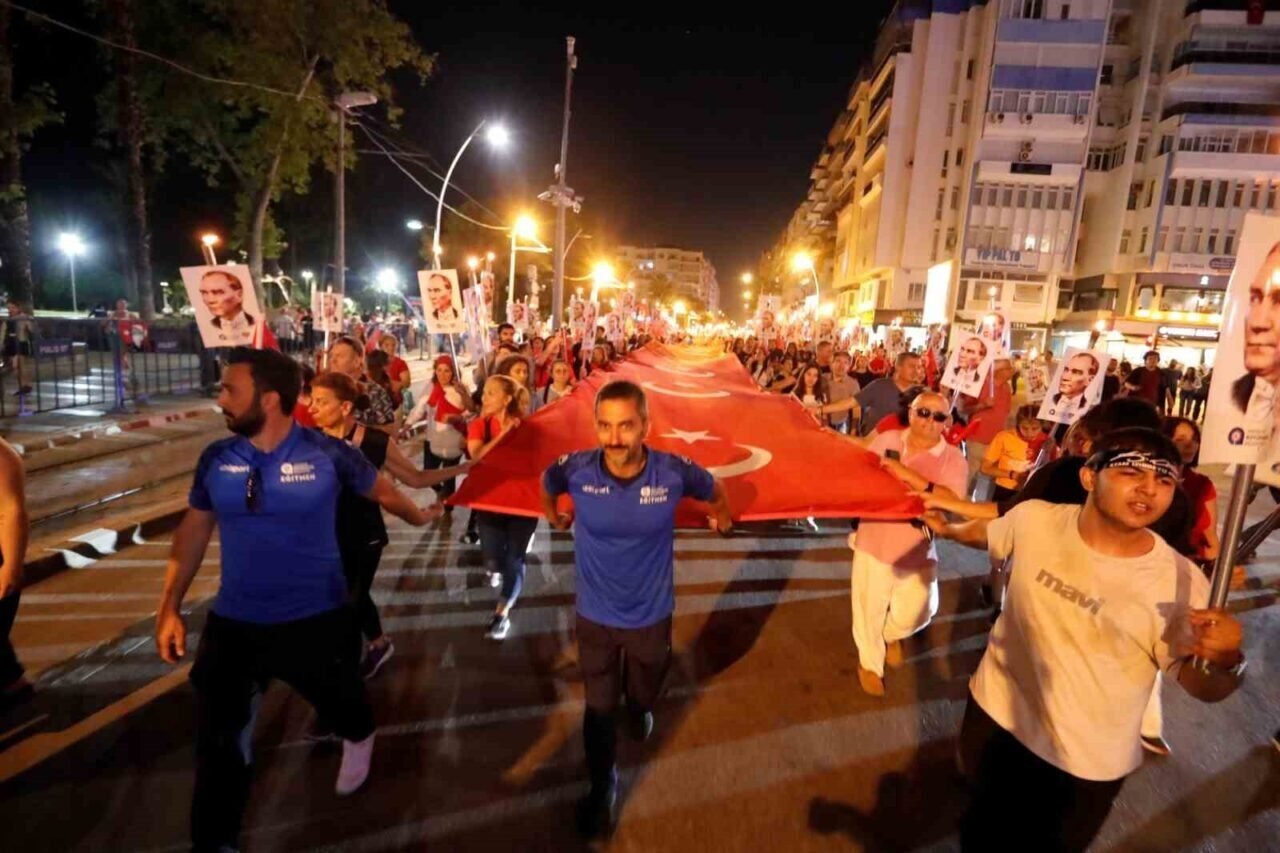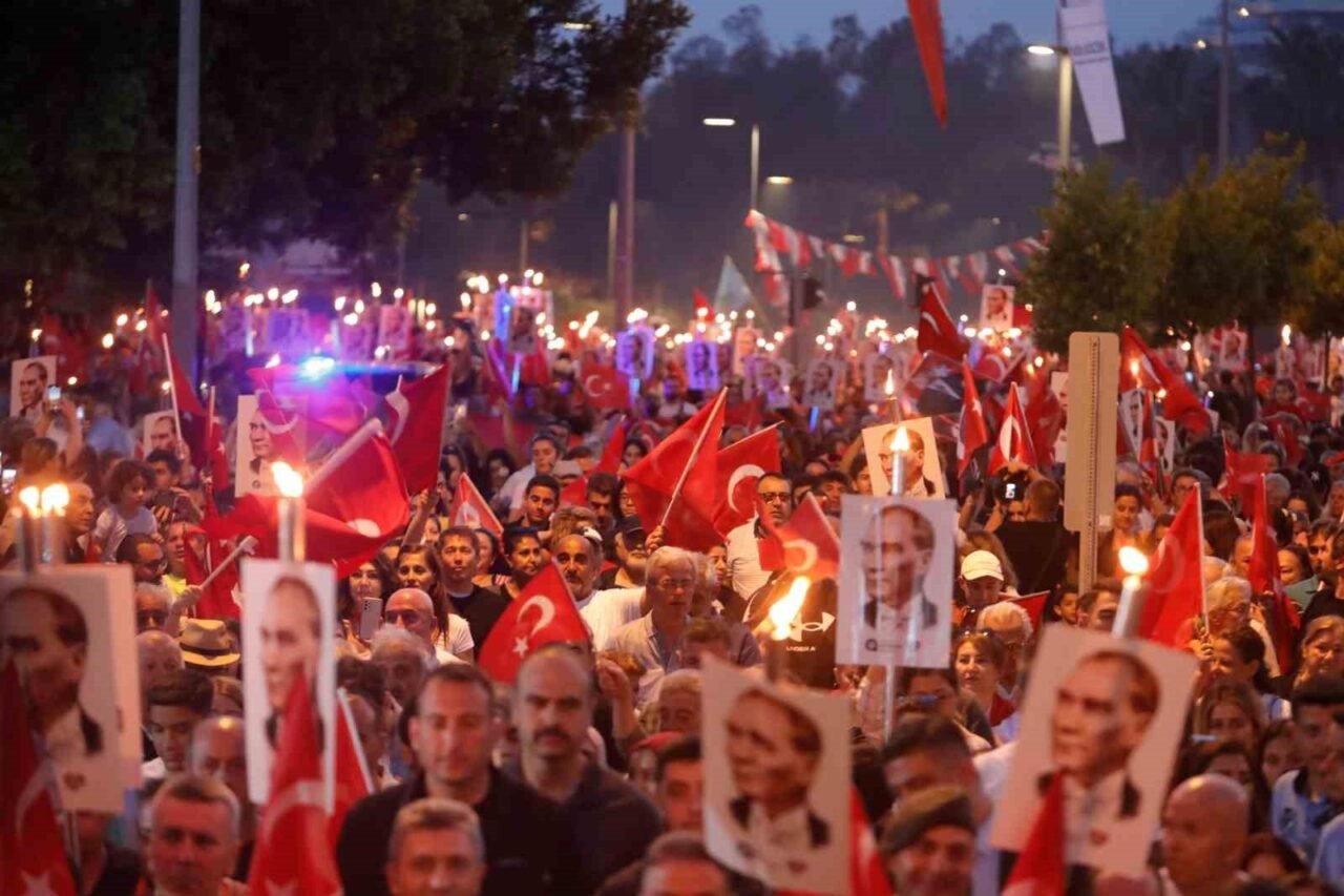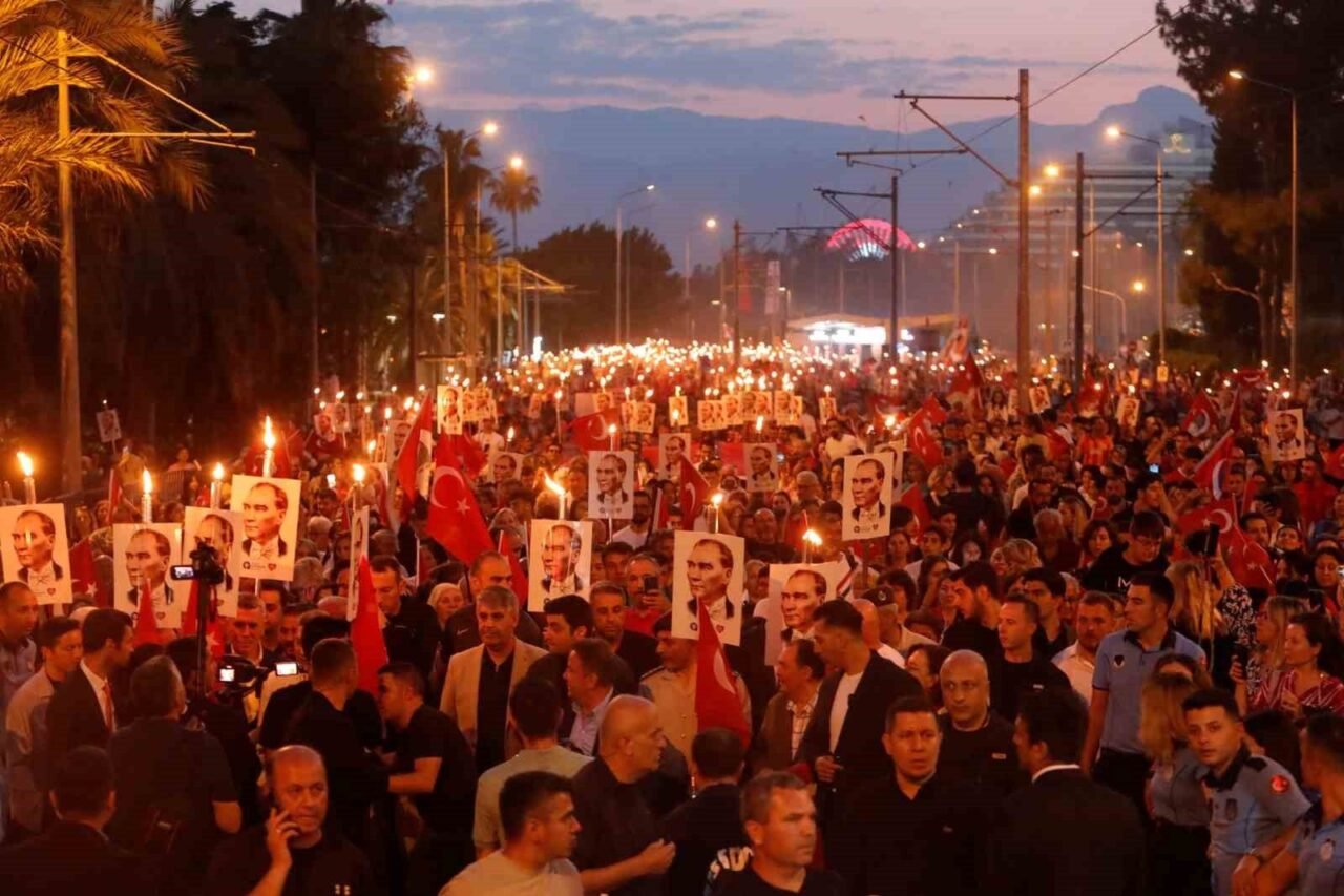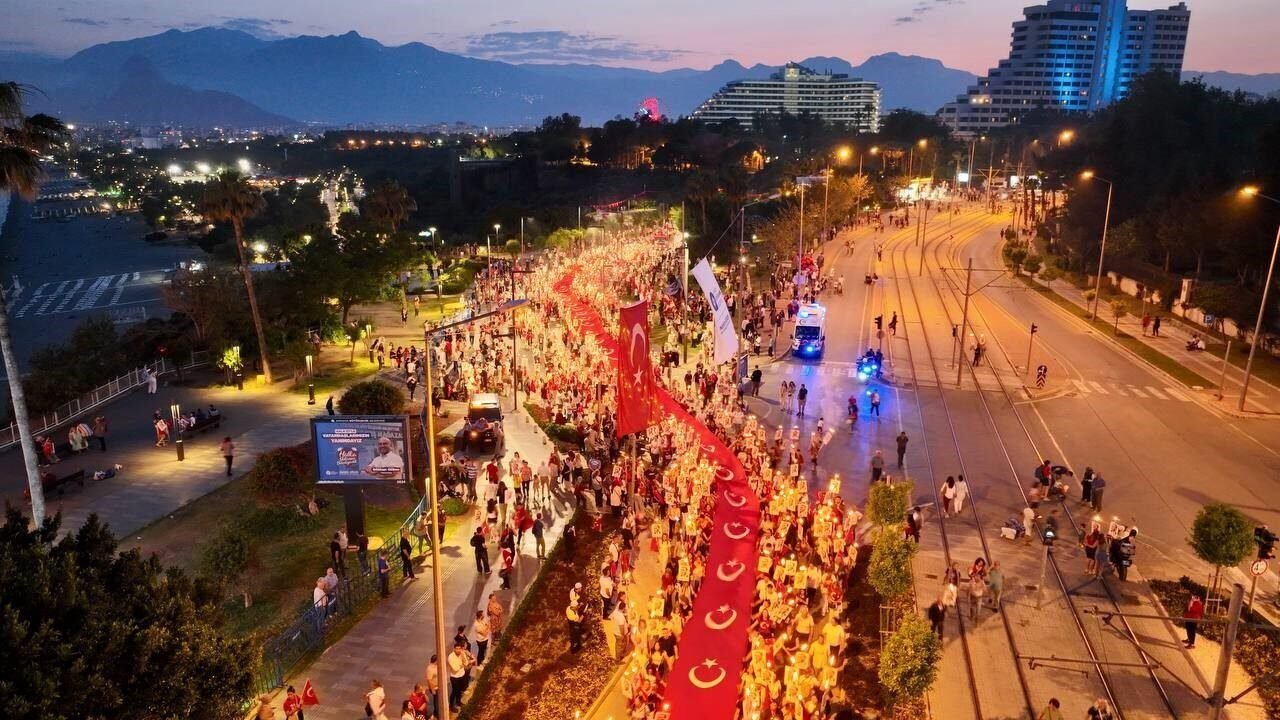Binlerce kişi akşam saatlerinde ellerinde Türk bayrakları ve Atatürk fotoğrafları ile Fener Alayı’nın başlangıç noktası olan Konyaaltı Varyant’ta toplanmaya başladı. Antalya Valisi Hulusi Şahin, Antalya Büyükşehir Belediye Başkanı Muhittin Böcek, 3. Piyade Eğitim Tugay Komutanı Piyade Albay Hüseyin Yılmaz, Muratpaşa Kaymakamı İhsan Kara, STK temsilcileri ve çok sayıda vatandaşın katıldığı yürüyüşte 400 metrelik dev Türk bayrağı taşındı. Fener Alayı’na Türk Hava Kurumu’na bağlı paramotorcular gökyüzünden eşlik ederken, yürüyüş güzergahındaki apartmanların balkonlarındaki vatandaşlar da alkışlarıyla destekledi. 7’den 70’e binlerce Antalyalı, ellerinde Türk bayraklarıyla sloganlar ve marşlar eşliğinde Cumhuriyet Meydanı’na kadar yürüdü.