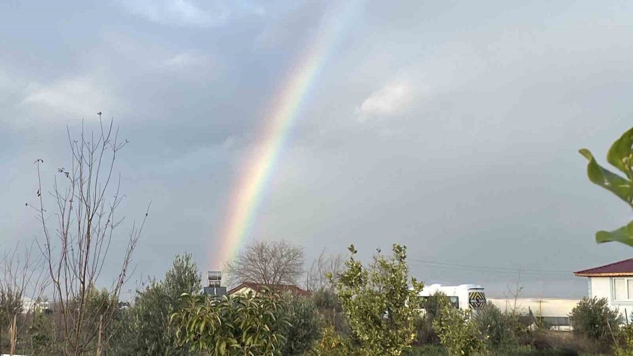 Antalya’da etkili olan yağmurun ardından Aksu ilçesinde beliren çifte gökkuşağı görsel şölen oluşturdu.
