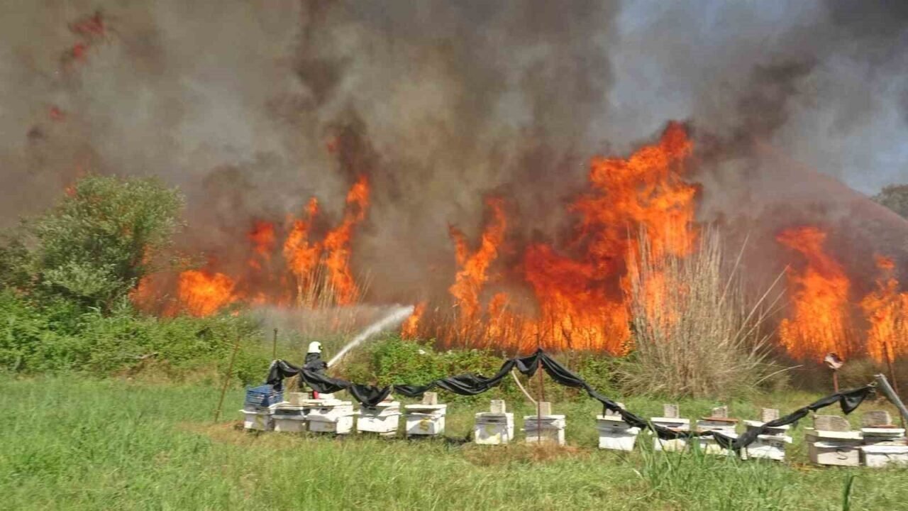 Şiddetli rüzgarla birlikte alevler ev, işyeri ve arı kovanlarının bulunduğu alana yönelince yürekler ağza geldi. İtfaiye erleri, yangın ile yerleşim noktalarının arasına girip set oldu. Yanı başlarına kadar gelen alevler karşısında bir adım dahi geri atmayan erler, alevleri söndürüp sıçramasını önledi.