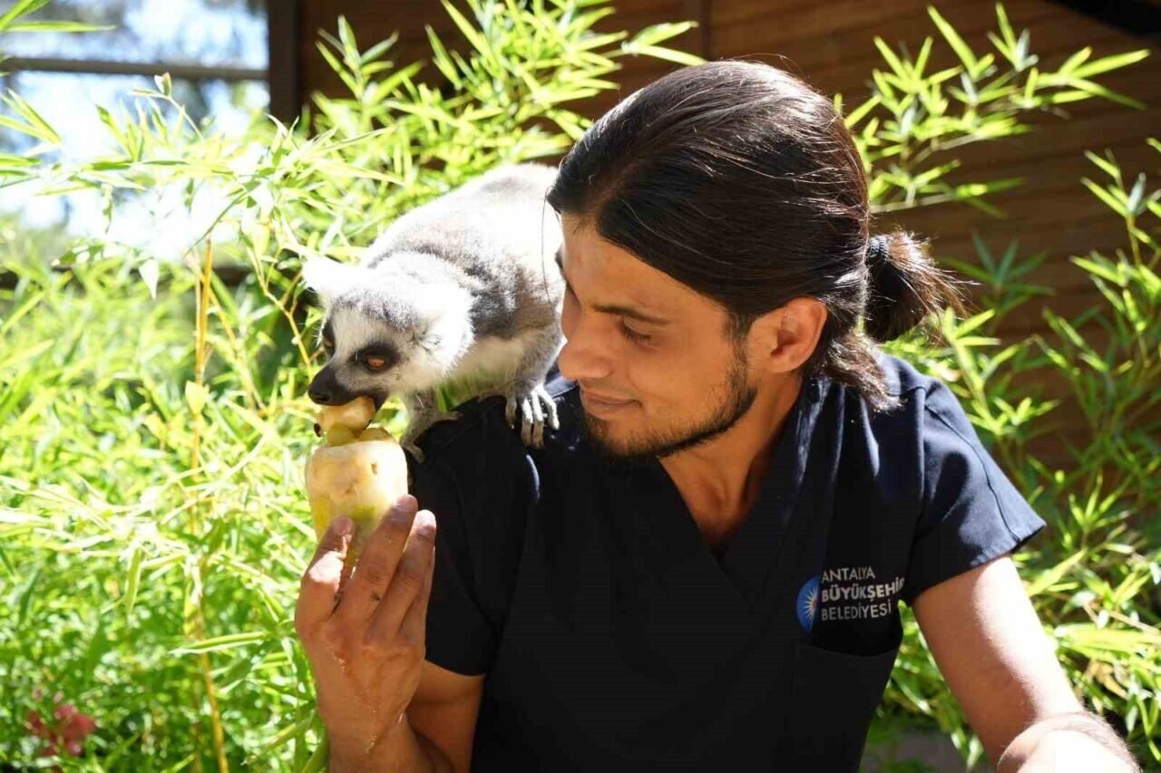Antalya Doğal Yaşam Parkı’ndaki bin 600 hayvan, bunaltıcı sıcaklarda buzlu meyve kokteyli, fıskiyelerle serinletiliyor. Antalya Doğal Yaşam Parkı Şube Müdürü Veteriner Hekim Aygül Arsun, “Lemurdan ayıya birçok tür için özel önlemler alıyoruz” dedi.