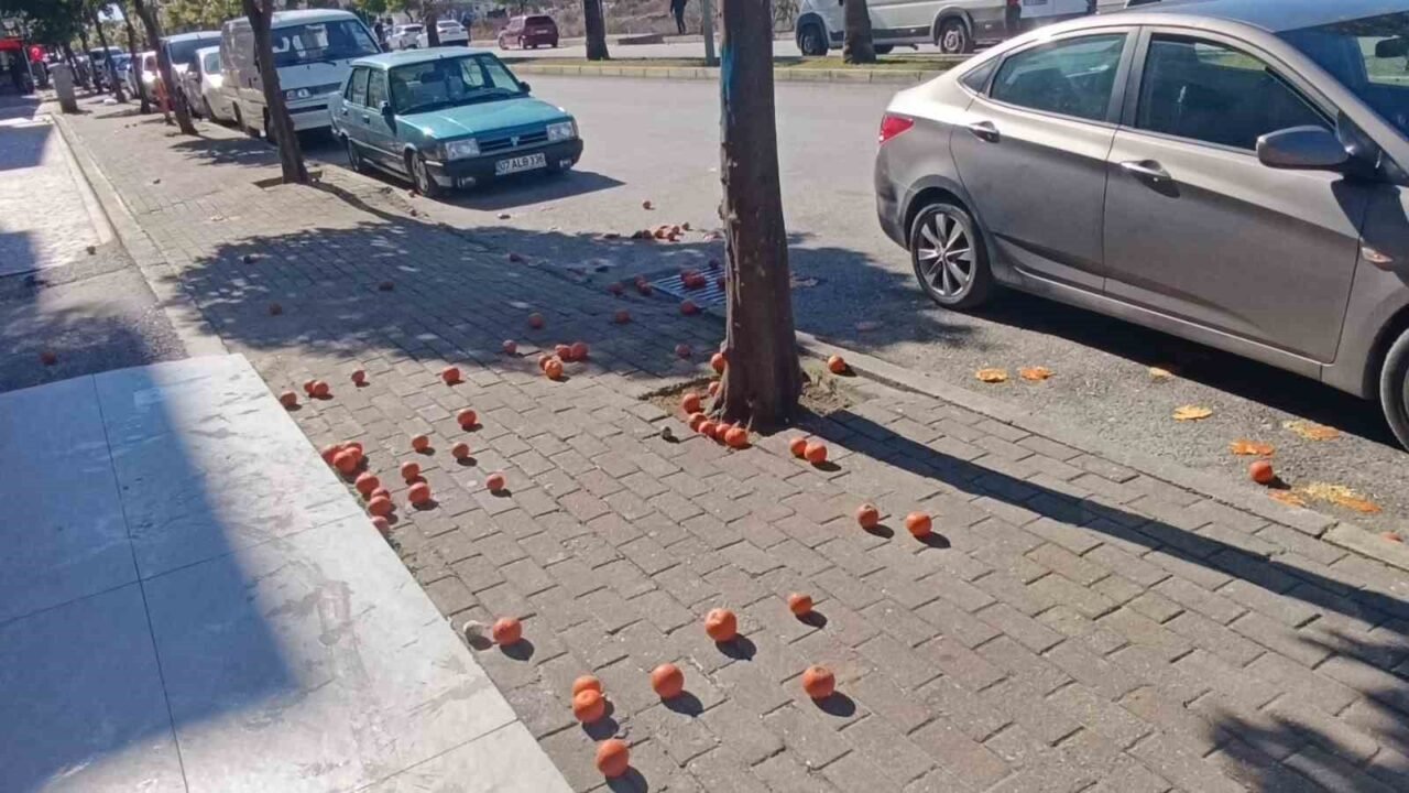 Antalya Manavgat’ta etkili olan şiddetli fırtına ilçenin sembolü olan turunçların kaldırım ve yollara dökülmesine neden oldu. Temizlik işleri ekipleri tarafından sık sık toplanmasına rağmen sürekli dökülen turunçlar nedeniyle yollar turuncu renge büründü.