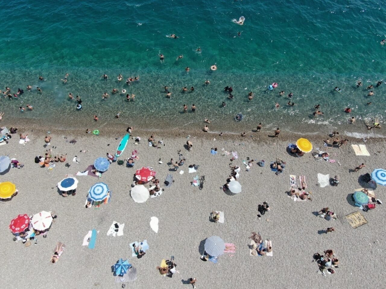 Antalya’da haziran ayında termometreler 35 dereceyi gösterdi. Yüksek nem ve bunaltıcı sıcağa rağmen kent sakinleri ve yabancı turistler Konyaaltı Sahilini doldurdu.