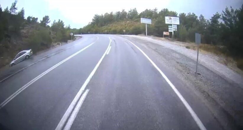 Öte yandan kaza anı karşı yönden gelmekte olan bir otomobilin araç kamerasına saniye saniye yansıdı. Görüntülerde, süratli bir şekilde viraja giren otomobilin yağış nedeniyle ıslanan yolda kayarak yoldan çıktığı ve yol kenarında bulunan yağmur suyu tahliye kanalına uçarak takla attığı görüldü.