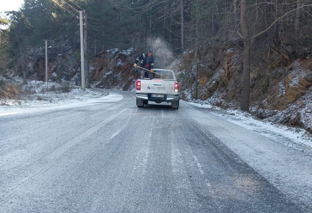 Antalya Büyükşehir Belediyesi, Alanya’nın kırsal bölgelerinde yolların trafiğe açık kalması için çalışma yapıyor. Büyükşehir ekipleri, yüksek kesimlerde tuzlama çalışması başlattı.