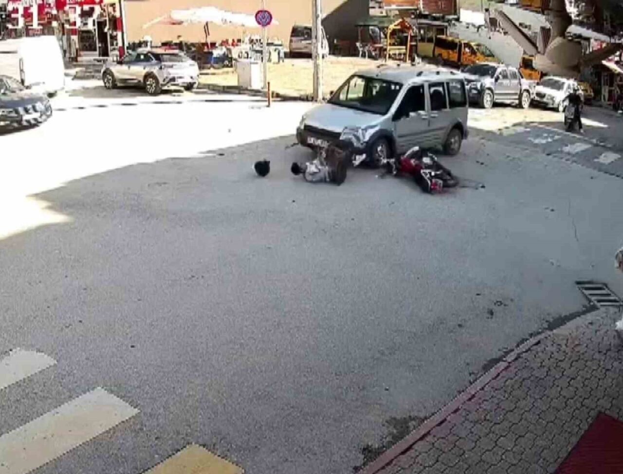 Araçla çarpışan motosikletliyi kaskı hayata tutundurdu, o anlar kamerada