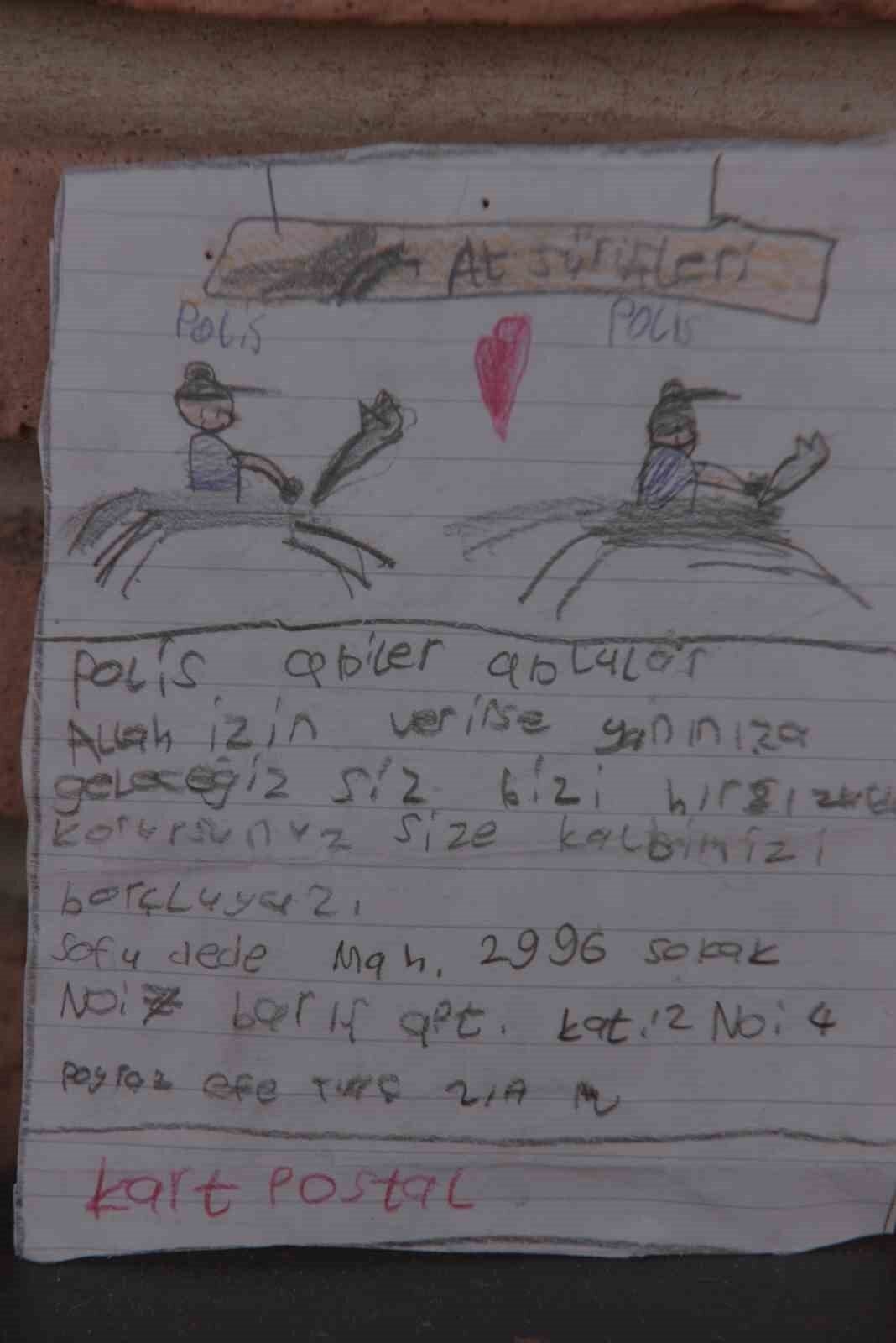 İlkokul ikinci sınıf öğrencisi Poyraz Efe Tuaç, Sarıçam ilçesine bağlı Çarkıpare Mahallesi’ndeki Şehit Ertan Tokuş İlkokulunda öğretim hayatına sürdürüyor. Poyraz Efe, okulda hayalini kurduğu atlı polislerin resmini çizdi. Çizdiği resmin altına ise Poyraz Efe, “Polis ağabeylerim ve ablalarım, Allah izin verirse yanınıza geleceğiz. Siz, bizi hırsızlardan korursunuz. Size kalbimizi borçluyuz” notunu yazdı.