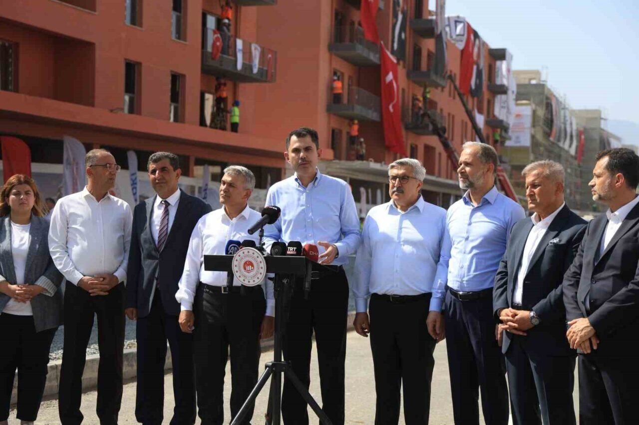 Çevre, Şehircilik ve İklim Değişikliği Bakanı Murat Kurum, çeşitli temaslarda ve incelemelerde bulunmak üzere Hatay’a geldi. Bakan Kurum, Antakya ilçesinin en önemli caddelerinden olan ve 6 Şubat depremlerinde çok sayıda binanın yıkıldığı Atatürk Caddesi’ndeki çalışmaları yerinde inceledi. Bakan Kurum, incelemelerinin ardından yaptığı açıklamada, “Ağustos ayı içinde 300 bininci konutumuzun anahtarlarını da Malatya’mızda Sayın Cumhurbaşkanımızın teşrifleriyle teslim edeceğiz. 2025 yılının sonuna geldiğimizde toplam 453 bin bağımsız bölümü tamamlamış ve her bir depremzede kardeşimizi yeni yuvasına kavuşturmuş olacağız. Birileri görmesin, duymasın, bizim milletimizle bu mutluluğumuza ortak olmasın. Onlar, hayallerinin bile ulaşamadığı eserlerimizi küçümsesin; biz onlara inat 11 ilimizi ayağa kaldıracağız. İnanın yılsonu geldiğinde bugün bu eserleri küçümseyenlerin hepsi susacak ve kimse tek bir kelime konuşamayacak” dedi.