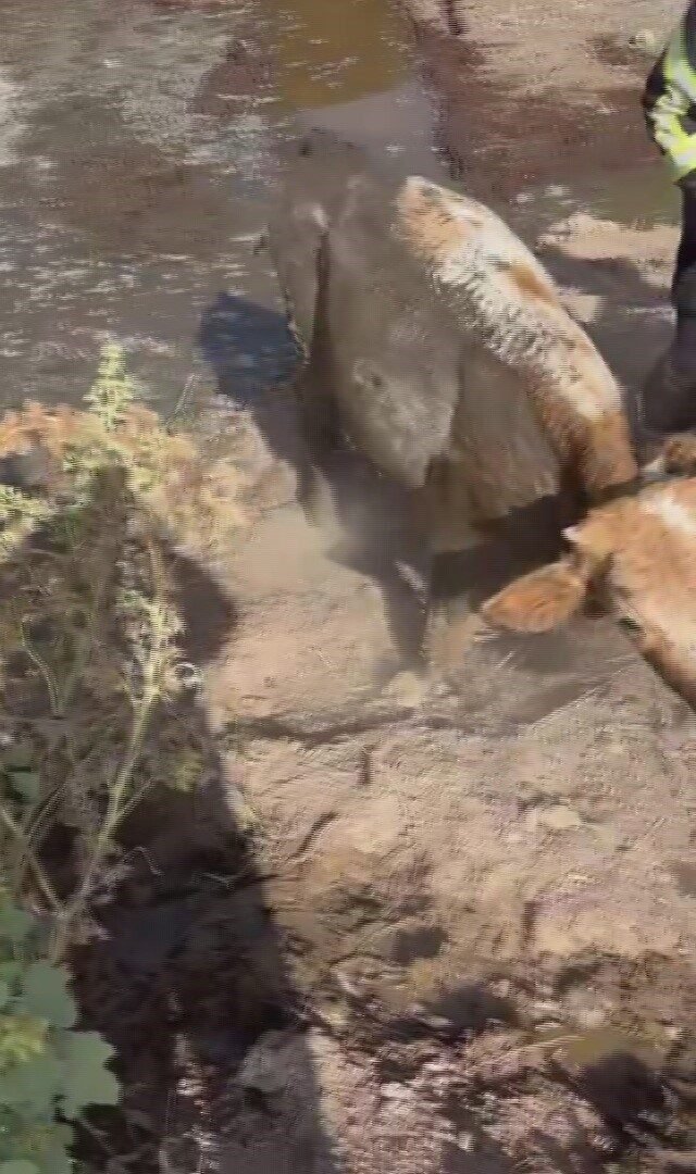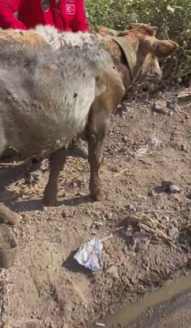 Hatay’da dere yatağında balçığa saplanan 3 inek, itfaiye ekipleri tarafından kurtarılarak sahibine teslim edildi.
