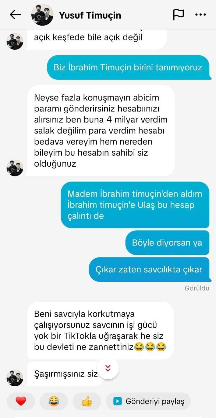 Anne Hatice Timuçin, kendi hesabını çalan şahsa ulaşıp savcılığa şikayet edeceklerini söylemesi üzerine, “Beni savcıyla mı korkutmaya çalışıyorsunuz? Savcının işi gücü yok bir Tiktok’la uğraşacak, siz bu devleti ne zannettiniz. Şaşırmışsınız siz” diyen şahıs, aileyle dalga geçti. Aile, bunun üzerine Şanlıurfa Cumhuriyet Başsavcılığı’na giderek suç duyurusunda bulundu.