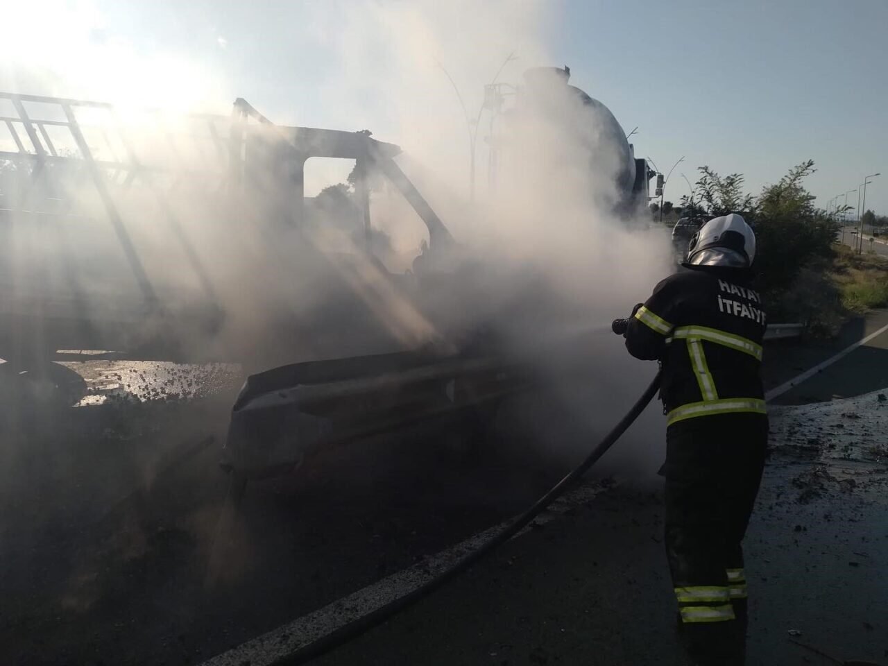 Kaza, Arsız ilçesi EXPO mevkiinde yaşandı. Seyir halindeyken bariyerlere çarpan pikap, alev alarak yanmaya başladı. İhbar üzerine bölgeye itfaiye ekipleri sevk edildi. Hatay Büyükşehir Belediyesi itfaiye ekiplerinin müdahalesiyle yangın kontrol altına alınarak söndürüldü. Yangında yaralanan olmazken, araç kullanılmaz hale geldi. Pikabın alev alev yandığı anlarsa kameraya yansıdı.