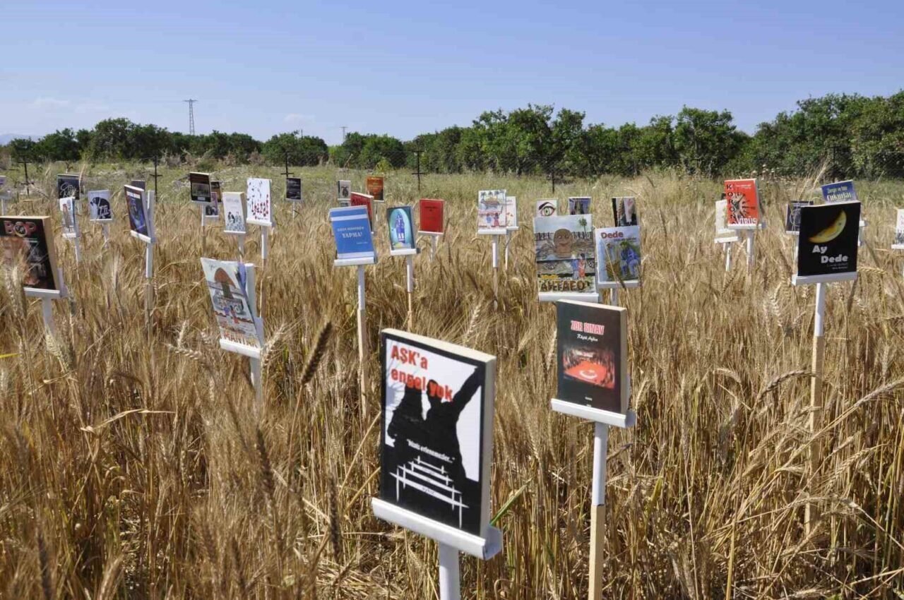Mersin Yazarlar Derneği üyeleri, kitap okuma alışkanlığına dikkat çekmek ve farkındalık oluşturmak amacıyla buğday tarlasındaki başaklara kitap astı.