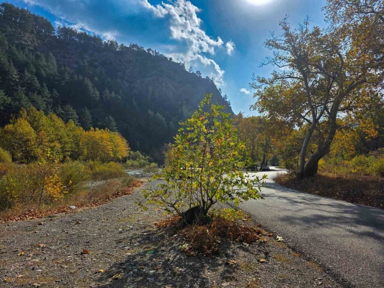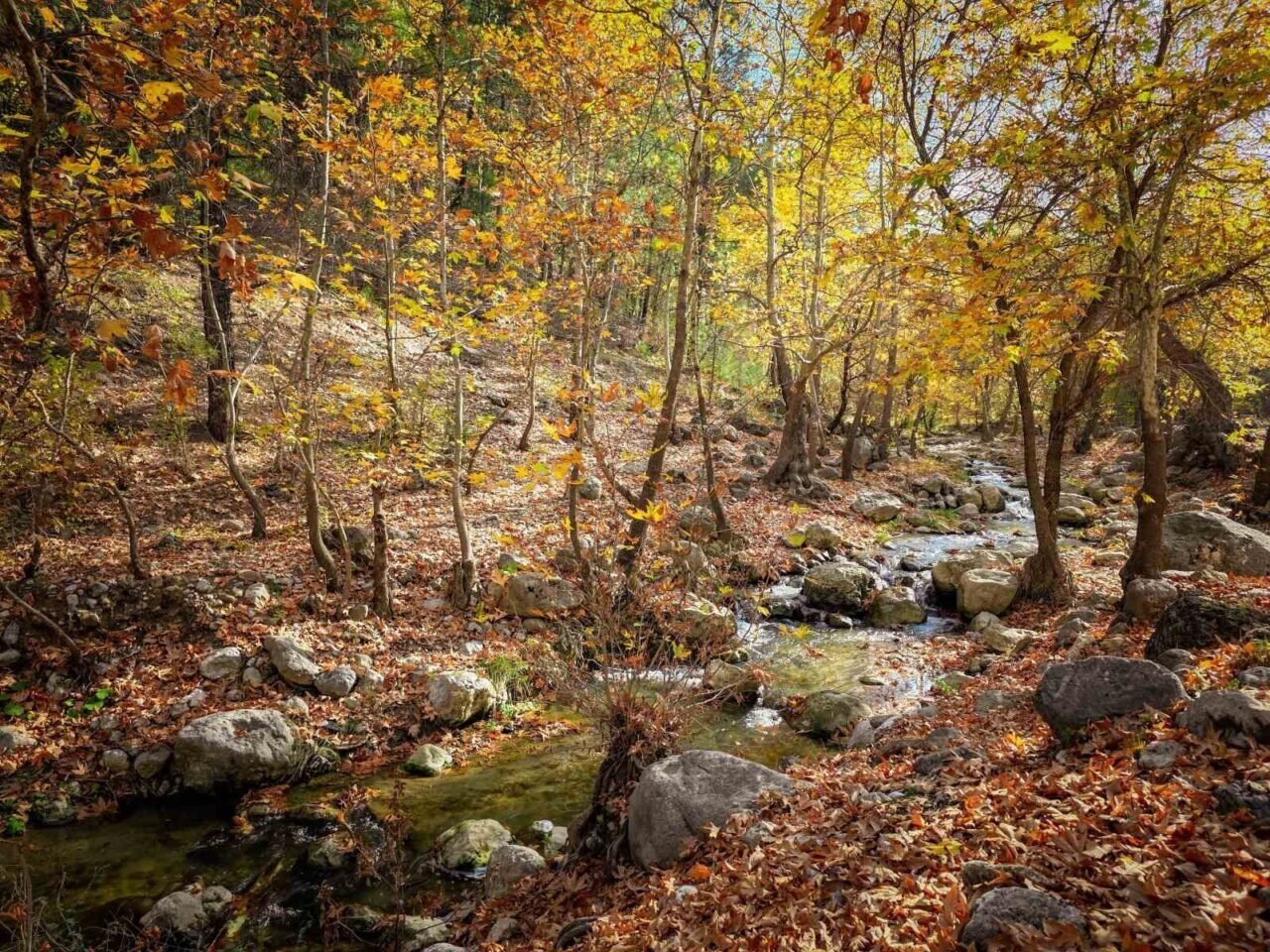 Kasım ayının en gözde doğa rotalarından biri olan Belemedik Tabiat Parkı, yeşil ve sarının bin bir tonunu barındıran çınar ağaçlarıyla adeta bir tabloyu andırdı.