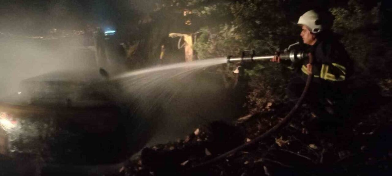 Hatay’da iş makinesinde çıkan yangın, ormanlık alana sıçramadan söndürüldü.